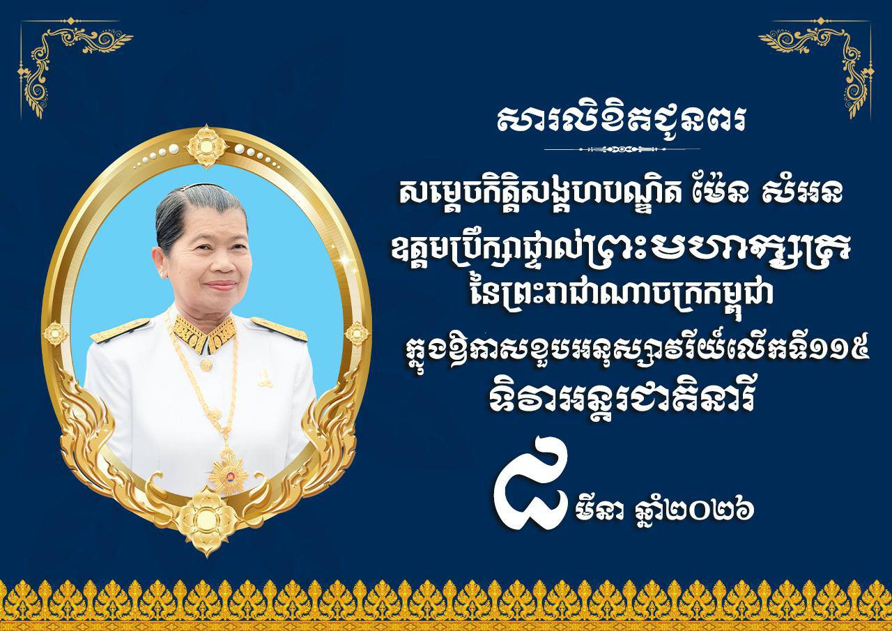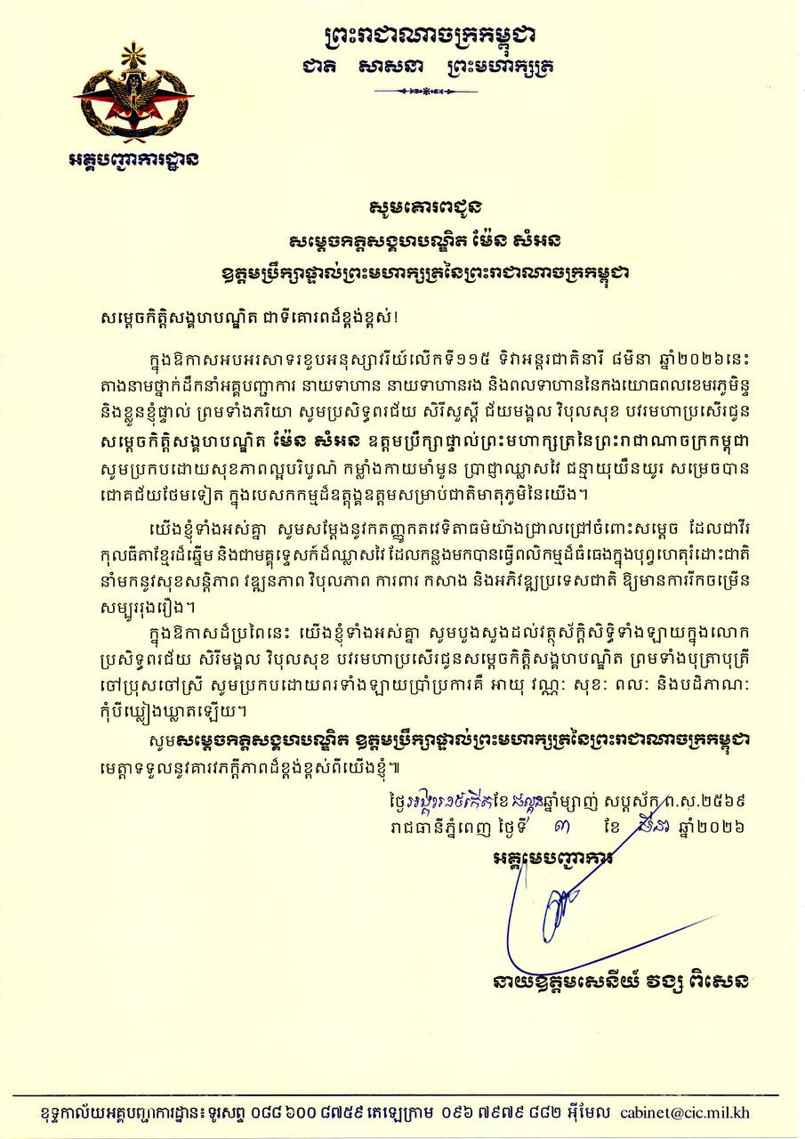 (ភ្នំពេញ)៖ ឯកឧត្ដម នាយឧត្ដមសេនីយ៍ វង្ស ពិសេន អគ្គមេបញ្ជាការនៃកងយោធពលខេមរភូមិន្ទ ព្រមទាំងថ្នាក់ដឹកនាំ នាយទាហាន នាយទាហានរង និងពលទាហានទាំងអស់នៃកងយោធពលខេមរភូមិន្ទ  បានផ្ញើសារលិខិតជូនពរ គោរពជូនសម្តេចកិត្តិសង្គហបណ្ឌិត ម៉ែន សំអន ឧត្តមប្រឹក្សាផ្ទាល់ព្រះមហាក្សត្រ នៃព្រះរាជាណាចក្រកម្ពុជា នៅក្នុងឱកាសដ៏មហានក្ខត្តឫក្ស ប្រកបដោយសិរីសួស្តី បវរថ្លៃថ្លាមហាប្រសើរនៃការរំលឹកខួបលើកទី១១៥ នៃទិវានារីអន្តរជាតិ ៨មីនា ឆ្នាំ២០២៦។