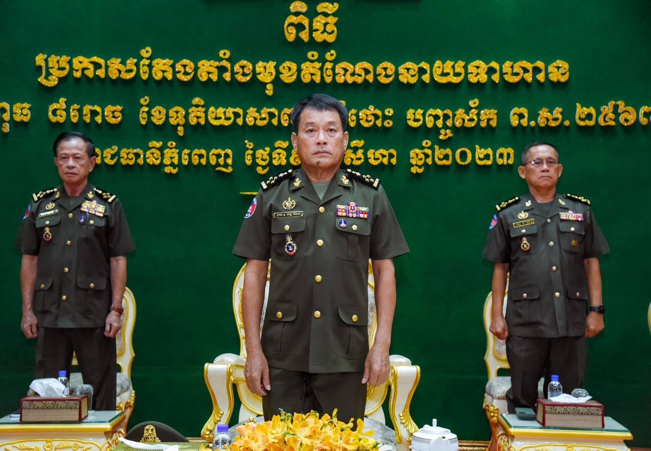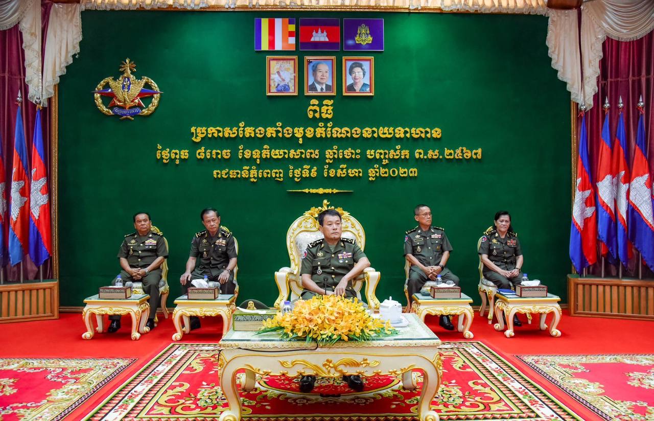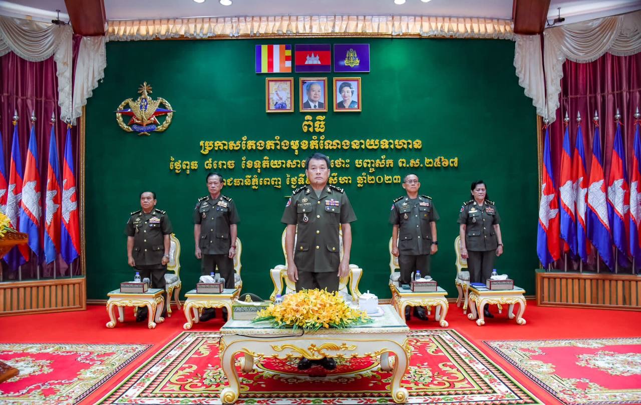 (ភ្នំពេញ)៖ ព្រឹកថ្ងៃទី០៩ ខែសីហា ឆ្នាំ២០២៣ ឯកឧត្តម នាយឧត្តមសេនីយ៍ វង្ស ពិសេន អគ្គមេបញ្ជាការនៃកងយោធពលខេមរភូមិន្ទ បានអញ្ជើញជាអធិបតីភាពក្នុងពិធីប្រកាសតែងតាំងមុខតំណែងនាយទាហាន នៅអគ្គបញ្ជាការដ្ឋាន។