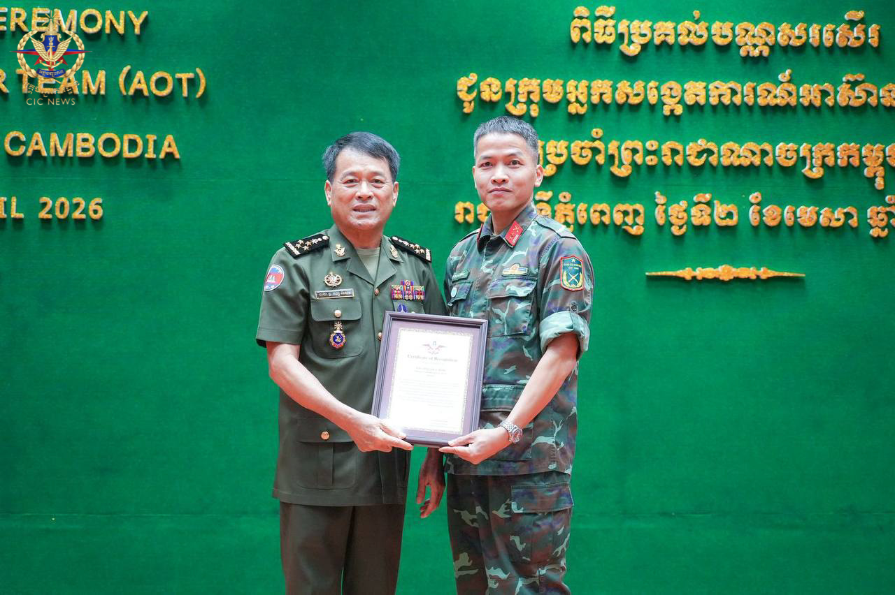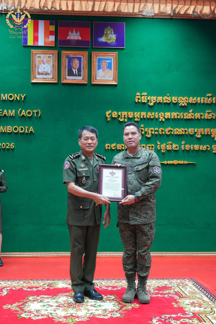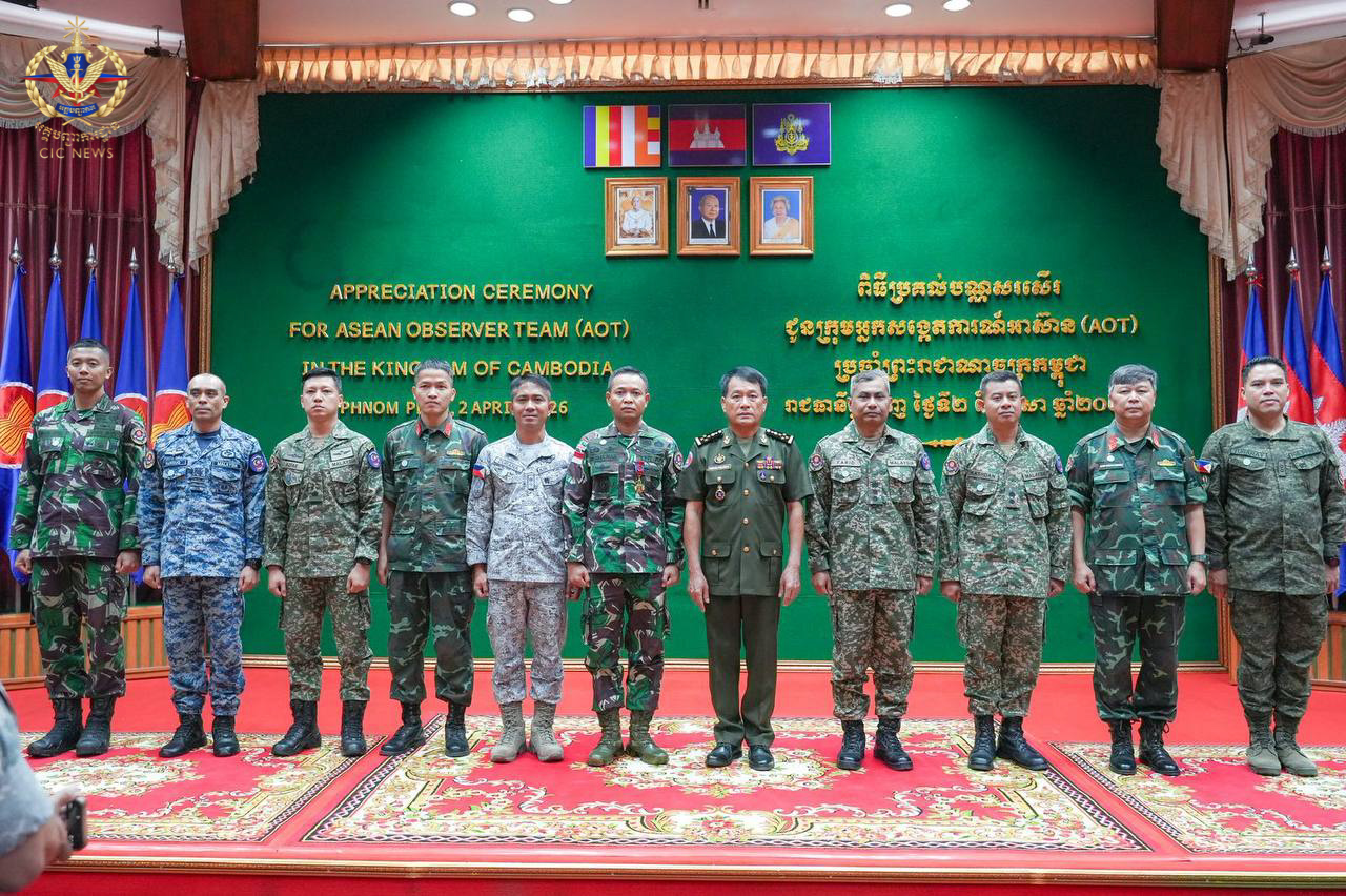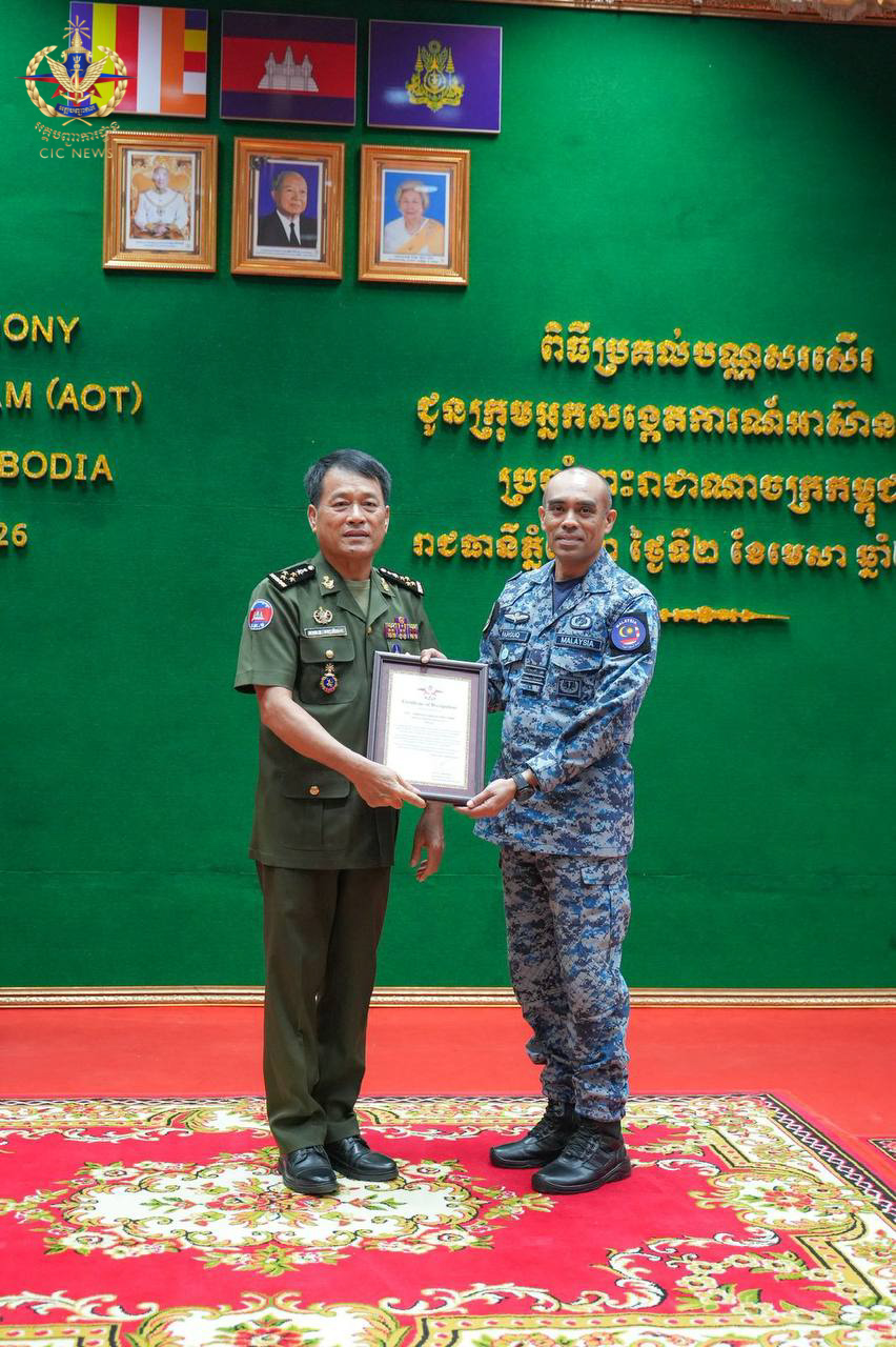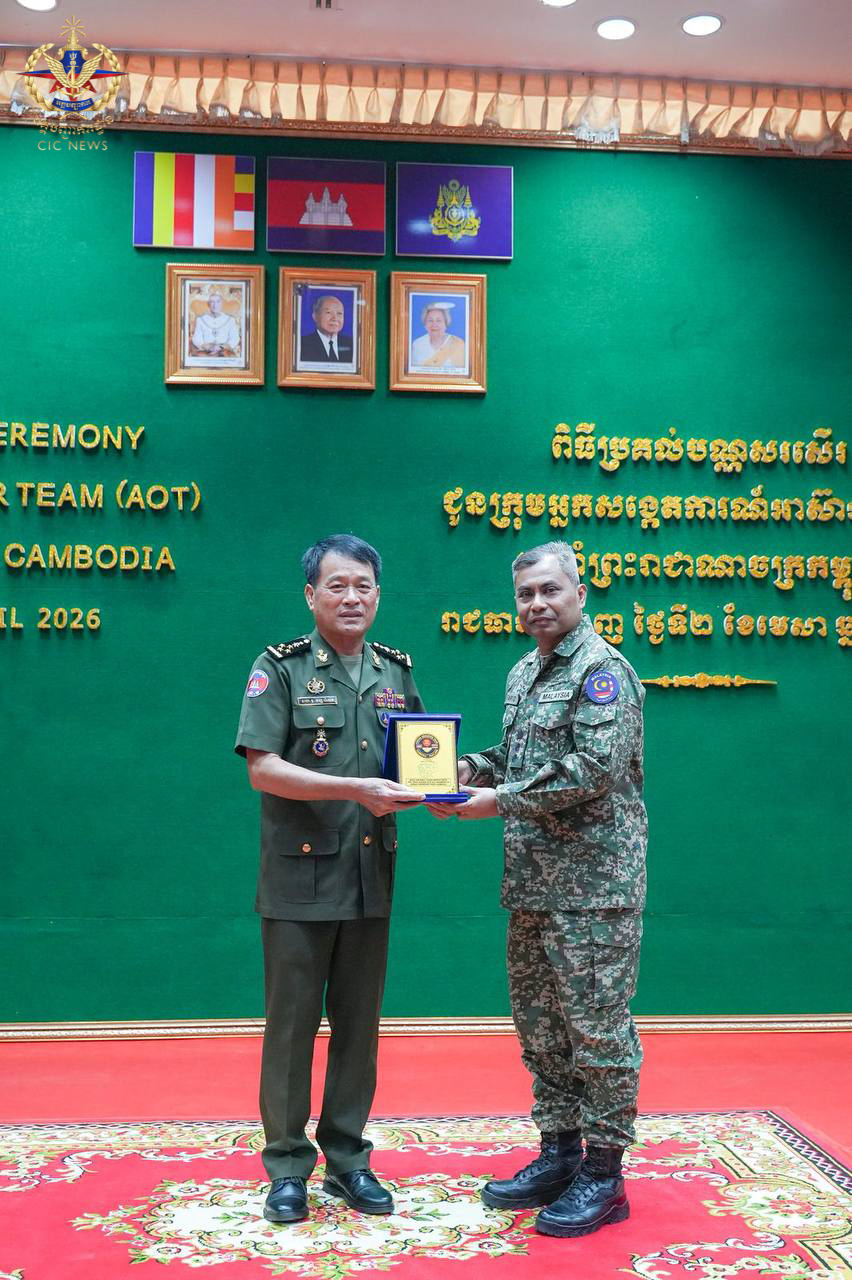 (ភ្នំពេញ)៖ នៅព្រឹកថ្ងៃទី០២ ខែមេសា ឆ្នាំ២០២៦ ឯកឧត្តម នាយឧត្តមសេនីយ៍ វង្ស ពិសេន អគ្គមេបញ្ជាការ នៃកងយោធពលខេមរភូមិន្ទ បានអញ្ជើញជាអធិបតីក្នុងពិធីសំណេះសំណាល និងប្រគល់ប័ណ្ណសរសើរជូនក្រុមអ្នកសង្កេតការអាស៊ាន (AOT) ប្រចាំព្រះរាជាណាចក្រកម្ពុជា។