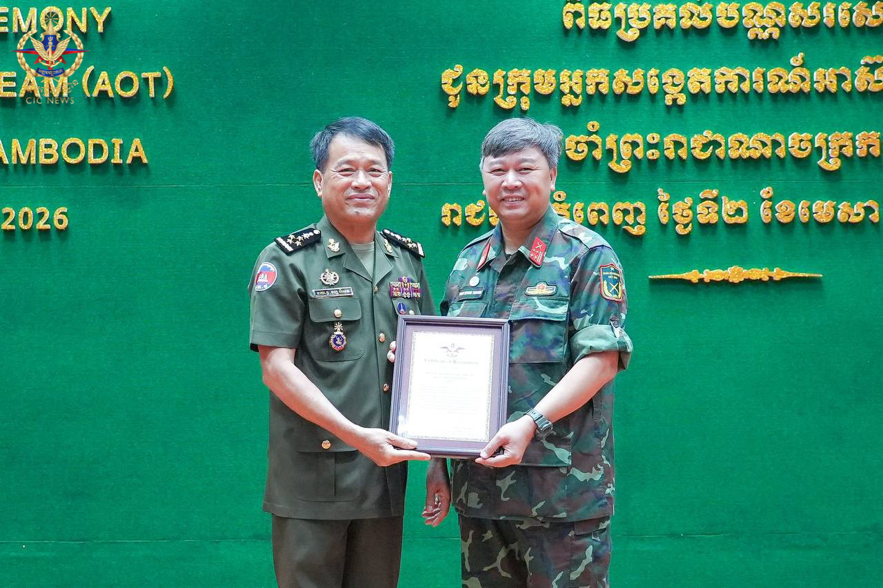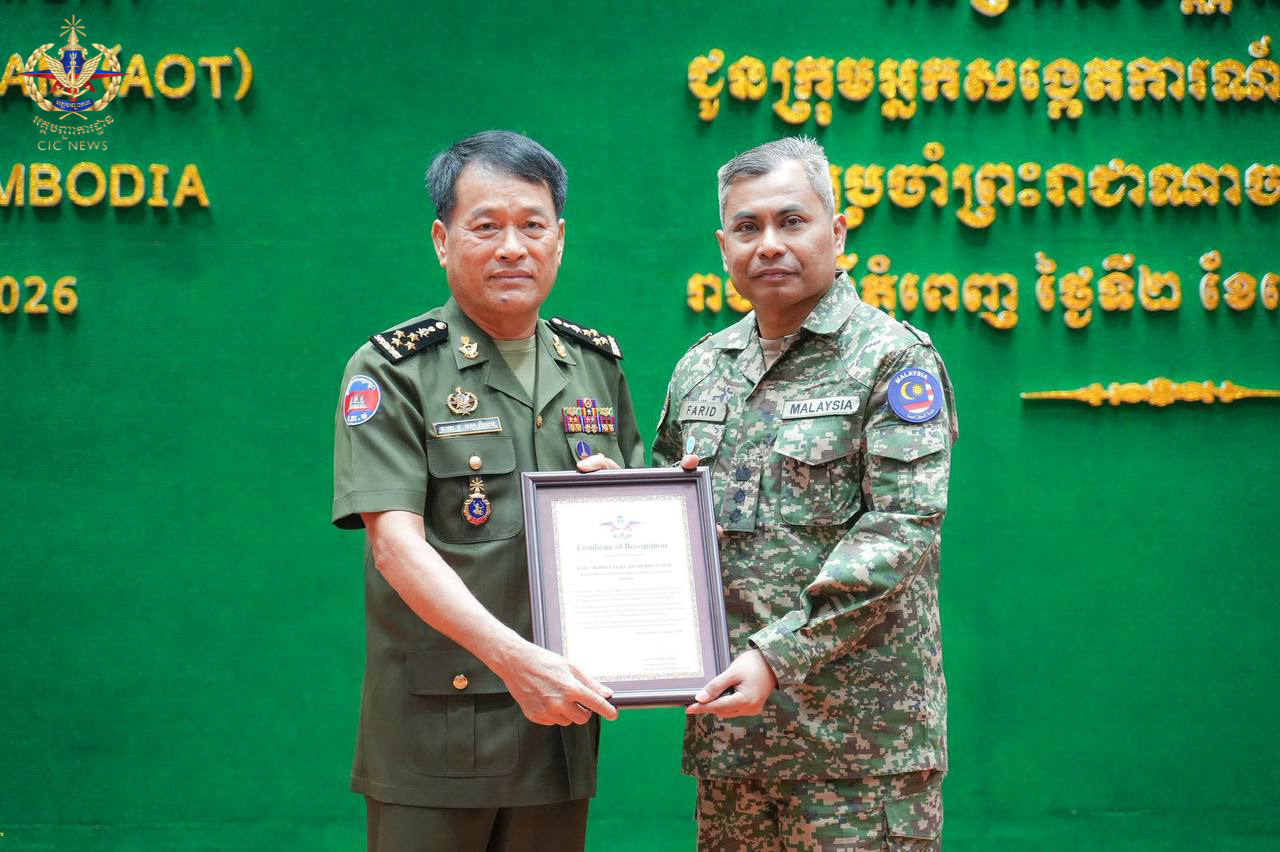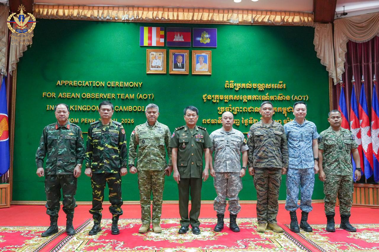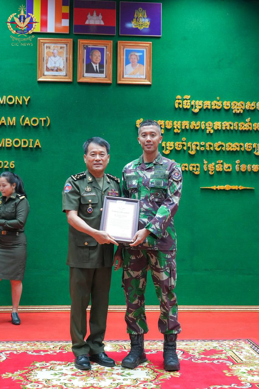 (ភ្នំពេញ)៖ នៅព្រឹកថ្ងៃទី០២ ខែមេសា ឆ្នាំ២០២៦ ឯកឧត្តម នាយឧត្តមសេនីយ៍ វង្ស ពិសេន អគ្គមេបញ្ជាការ នៃកងយោធពលខេមរភូមិន្ទ បានអញ្ជើញជាអធិបតីក្នុងពិធីសំណេះសំណាល និងប្រគល់ប័ណ្ណសរសើរជូនក្រុមអ្នកសង្កេតការអាស៊ាន (AOT) ប្រចាំព្រះរាជាណាចក្រកម្ពុជា។