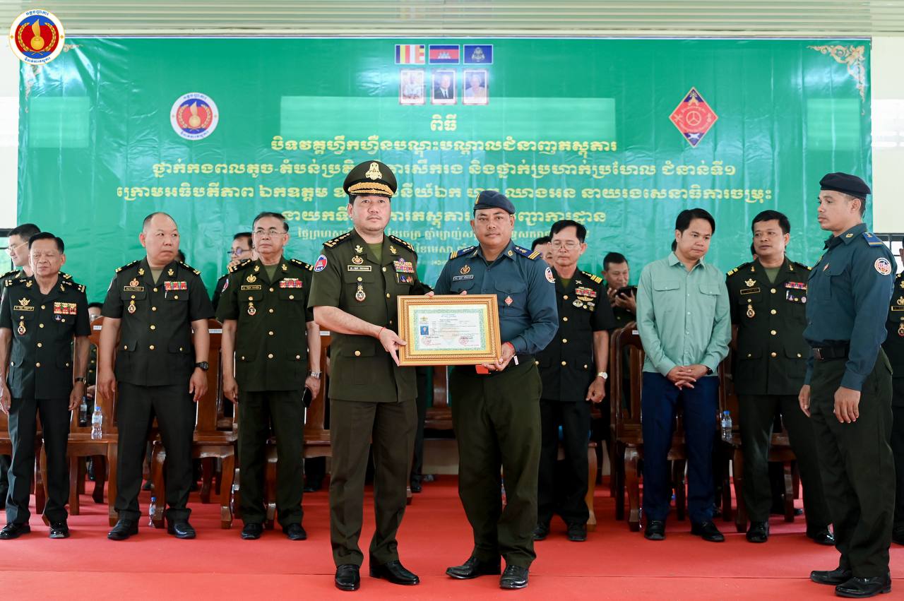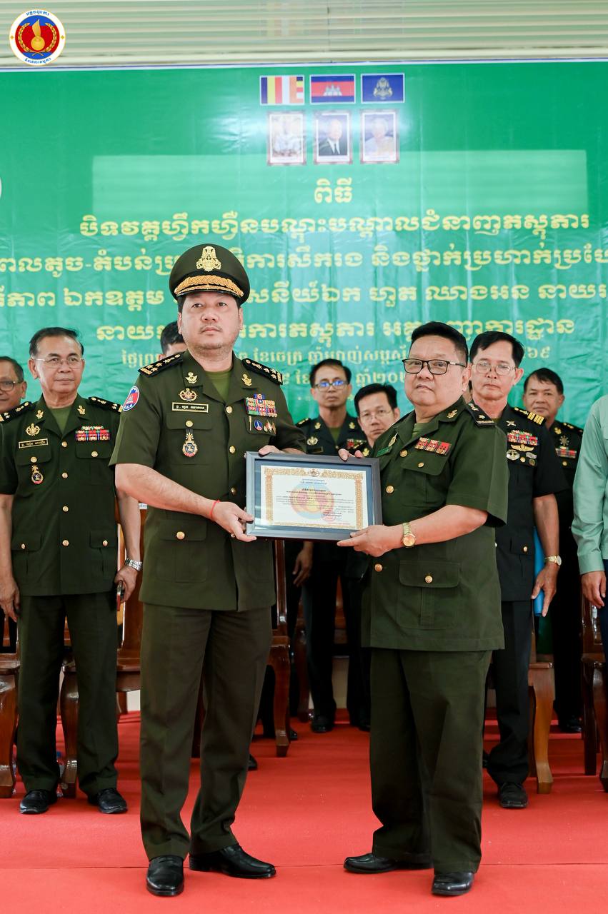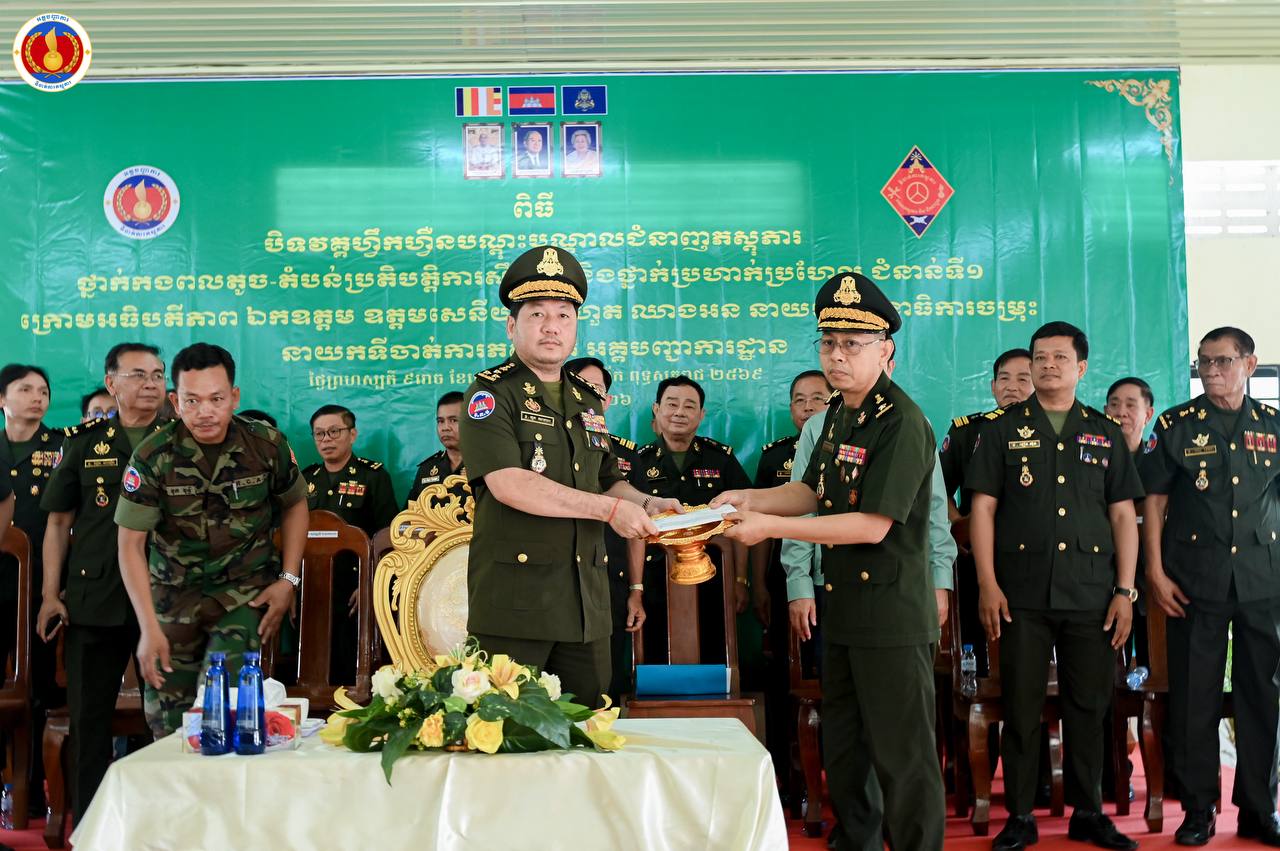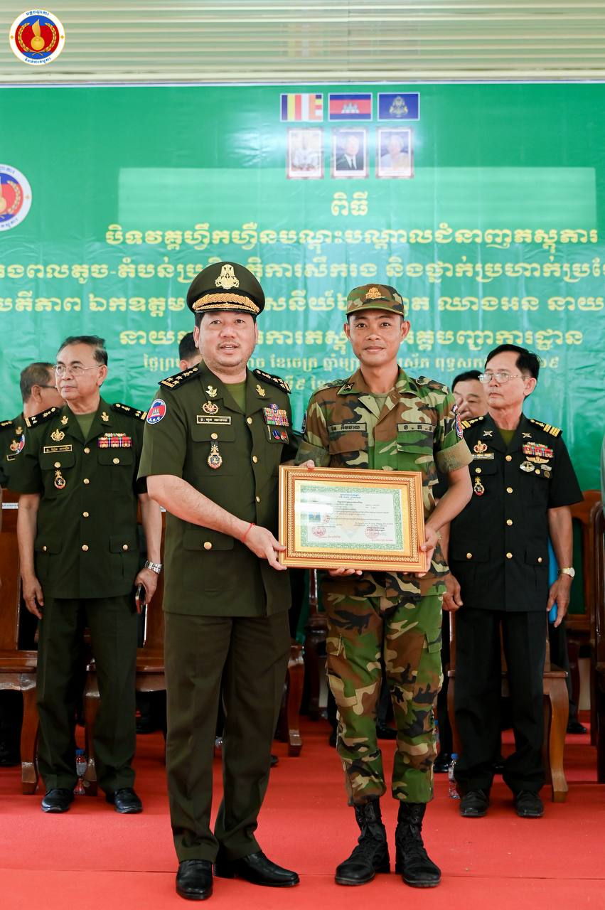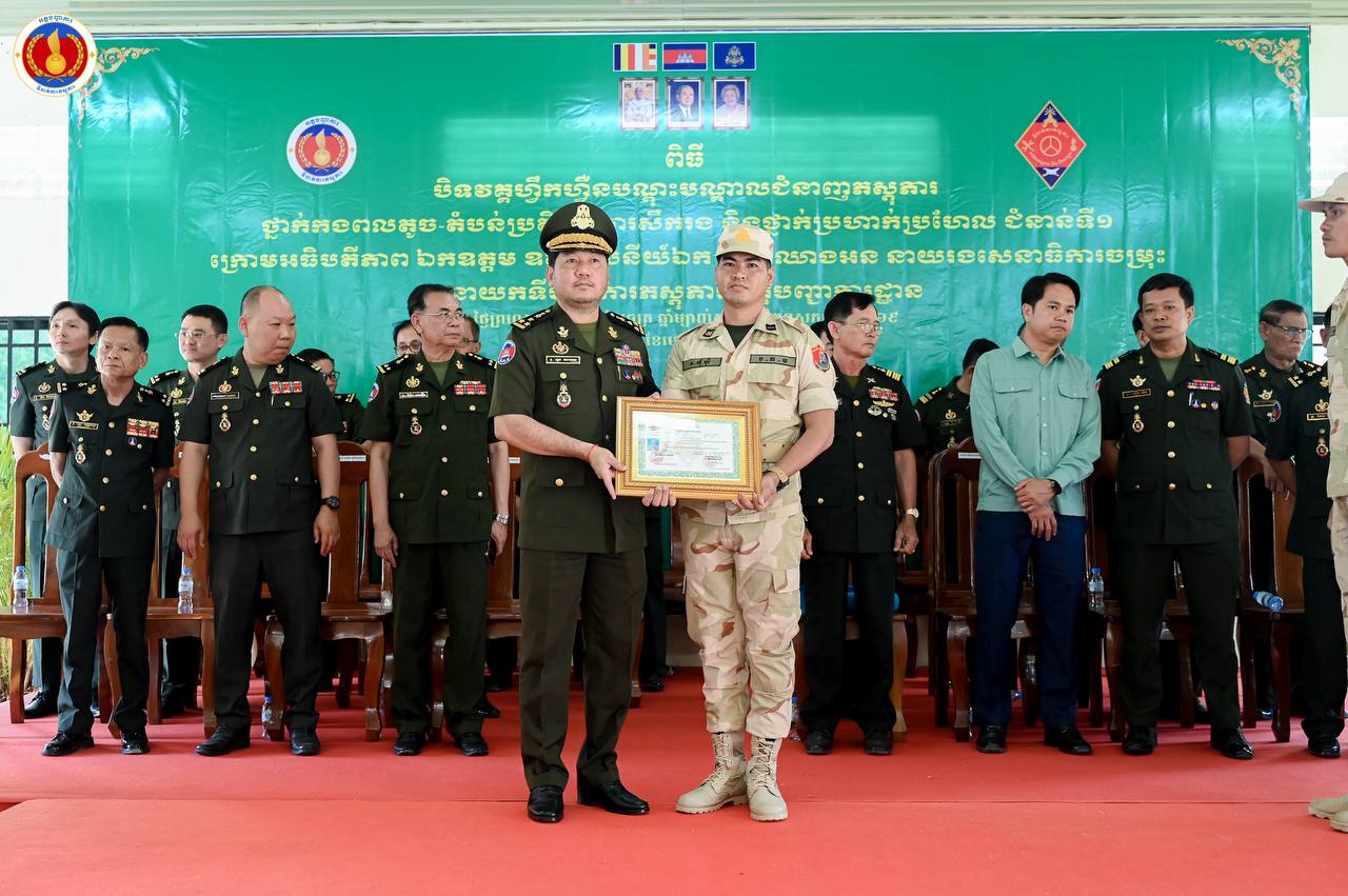 (ព្រៃវែង)៖ ឧត្តមសេនីយ៍ឯក ហួត ឈាងអន នាយរងសេនាធិការចម្រុះ នាយកទីចាត់ការភស្តុភារ អគ្គបញ្ជាការ តំណាងដ៏ខ្ពង់ខ្ពស់ ឯកឧត្ដម នាយឧត្ដមសេនីយ៍ វង្ស ពិសេន អគ្គមេបញ្ជាការនៃកងយោធពលខេមរភូមិន្ទ បានអញ្ជើញជាអធិបតីក្នុងពិធីបិទវគ្គហ្វឹកហ្វឺនបណ្តុះបណ្តាលជំនាញភស្តុភារ ថ្នាក់កងពលតូច តំបន់ប្រតិបត្តិការសឹករង និងថ្នាក់ប្រហាក់ប្រហែល ជំនាន់ទី១ ឆ្នាំ២០២៥ នៅសាលាភស្តុភារ និងដឹកជញ្ជូន (ភ្នំឈើកាច់)។