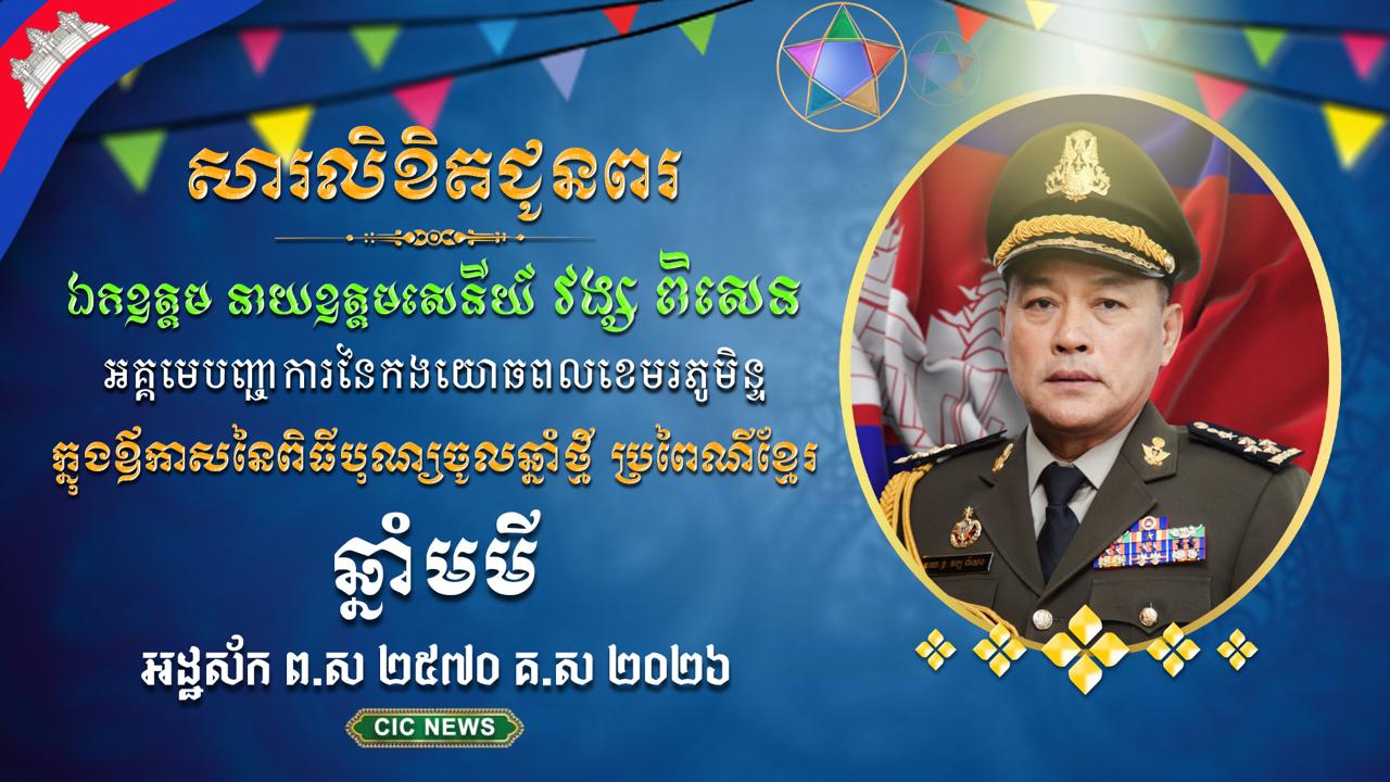 (ភ្នំពេញ)៖ ឯកឧត្ដម នាយឧត្តមសេនីយ៍ គីម ប៊ុនថាន អគ្គមេបញ្ជាការរងកងយោធពលខេមរភូមិន្ទ សូមផ្ញើសារលិខិតគោរពជូនពរឯកឧត្ដម នាយឧត្ដមសេនីយ៍ វង្ស ពិសេន អគ្គមេបញ្ជាការនៃកងយោធពលខេមរភូមិន្ទ ក្នុងឱកាសពិធីបុណ្យចូលឆ្នាំថ្មី ប្រពៃណីជាតិខ្មែរ ឆ្នាំមមី អដ្ឋស័ក ព.ស ២៥៧០ គ.ស ២០២៦។