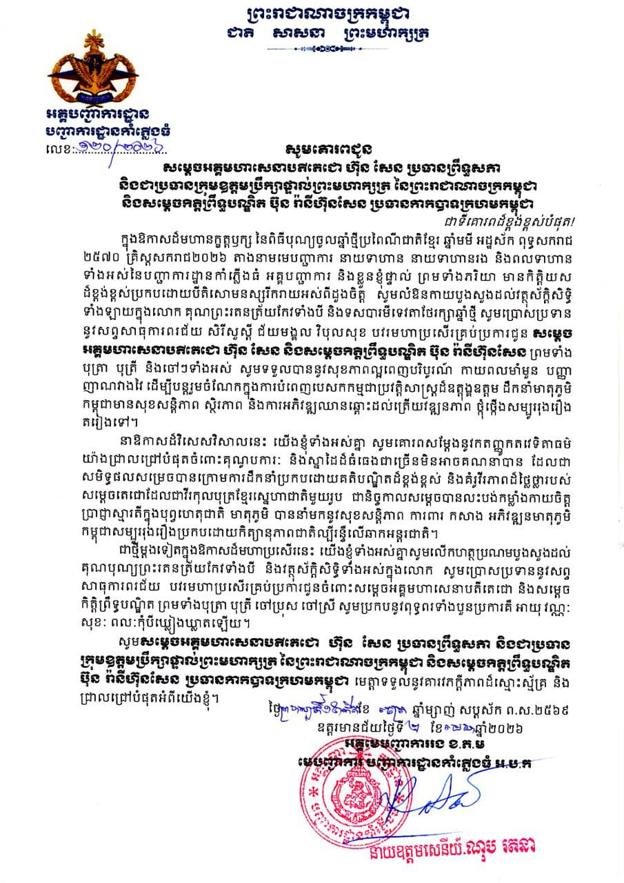 (ភ្នំពេញ)៖ ឯកឧត្ដម នាយឧត្តមសេនីយ៍ សាស្រ្តាចារ្យ បណ្ឌិត ណុប រតនា អគ្គមេបញ្ជាការរង នៃកងយោធពលខេមរភូមិន្ទ និងជាមេបញ្ជាការ បញ្ជាការដ្ឋានកាំភ្លើងធំ អគ្គបញ្ជាការ ព្រមទាំងនាយទាហាន នាយទាហានរង ពលទាហានទាំងអស់ សូមផ្ញើសារលិខិតគោរពជូនពរ សម្ដេចអគ្គមហាសេនាបតីតេជោ ហ៊ុន សែន ប្រធានព្រឹទ្ធសភានៃកម្ពុជា និងសម្ដេចកិត្តិព្រឹទ្ធបណ្ឌិត ប៊ុន រ៉ានី ហ៊ុនសែន ប្រធានកាកបាទក្រហមកម្ពុជា នៅក្នុងឱកាសពិធីបុណ្យចូលឆ្នាំថ្មី ប្រពៃណីជាតិខ្មែរ ឆ្នាំមមី អដ្ឋស័ក ព.ស.២៥៧០ គ.ស ២០២៦។