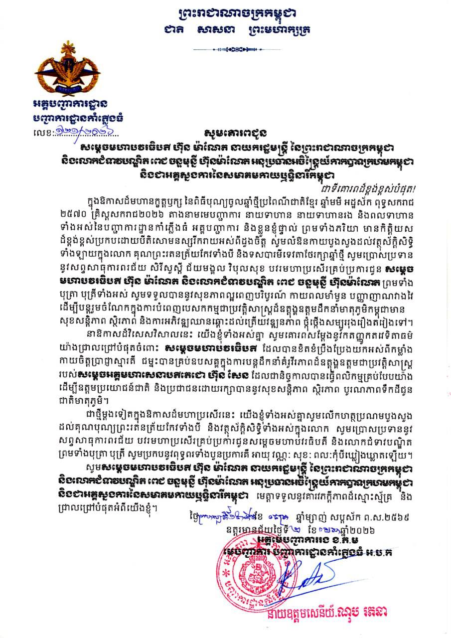 (ភ្នំពេញ)៖ ឯកឧត្ដម នាយឧត្តមសេនីយ៍ សាស្រ្តាចារ្យ បណ្ឌិត ណុប រតនា អគ្គមេបញ្ជាការរង នៃកងយោធពលខេមរភូមិន្ទ និងជាមេបញ្ជាការ បញ្ជាការដ្ឋានកាំភ្លើងធំ អគ្គបញ្ជាការ ព្រមទាំងនាយទាហាន នាយទាហានរង ពលទាហានទាំងអស់ សូមផ្ញើសារលិខិតគោរពជូនពរ សម្ដេចមហាបវរធិបតី ហ៊ុន ម៉ាណែត នាយករដ្ឋមន្ត្រីនៃកម្ពុជា និងលោកជំទាវបណ្ឌិត ពេជ ចន្ទមុន្នី ហ៊ុនម៉ាណែត នៅក្នុងឱកាសពិធីបុណ្យចូលឆ្នាំថ្មី ប្រពៃណីជាតិខ្មែរ ឆ្នាំមមី អដ្ឋស័ក ព.ស.២៥៧០ គ.ស ២០២៦។