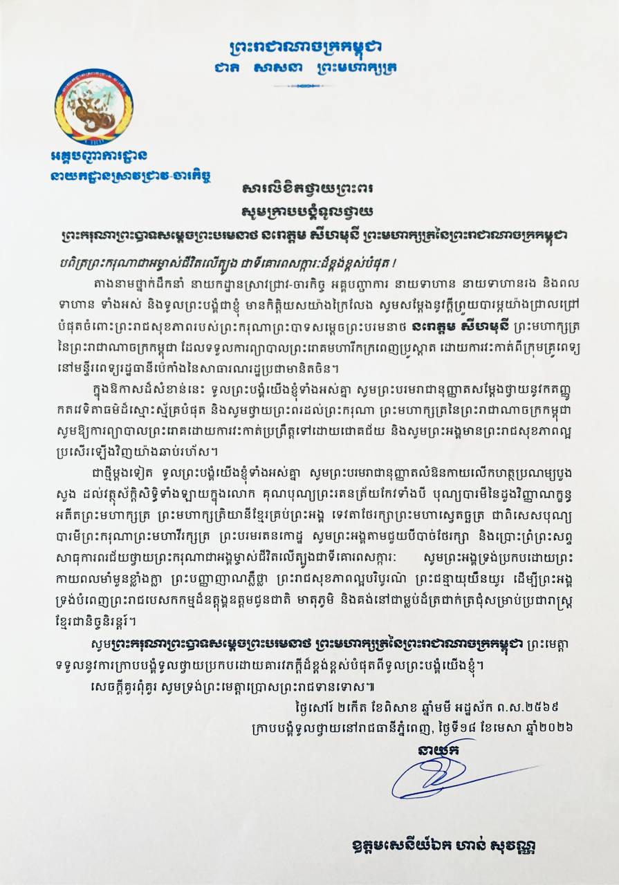 ទូលព្រះបង្គំជាខ្ញុំ សូមសម្តែងនូវក្តីបារម្ភ ក្រោយពីទទួលព័ត៌មានថា ព្រះរោគមហារីកក្រពេញប្រូស្តាត (prostate cancer) របស់ព្រះករុណា ជាអម្ចាស់ជីវិតលើត្បូង ជាទីគោរពសក្ការៈដ៏ខ្ពង់ខ្ពស់បំផុត តម្រូវឱ្យព្រះអង្គទទួលការព្យាបាលដោយការវះកាត់តាមវេជ្ជបញ្ជា នៅមន្ទីរពេទ្យនារដ្ឋធានីប៉េកាំង នៃសាធារណរដ្ឋប្រជាមានិតចិន និងបន្តគង់ប្រថាប់នៅទីនោះមួយរយៈពេល ដើម្បីតាមដានត្រួតពិនិត្យ និងព្យាបាលព្រះរោគ ចាប់ពីថ្ងៃទី១៨ ខែមេសា ឆ្នាំ២០២៦នេះ។