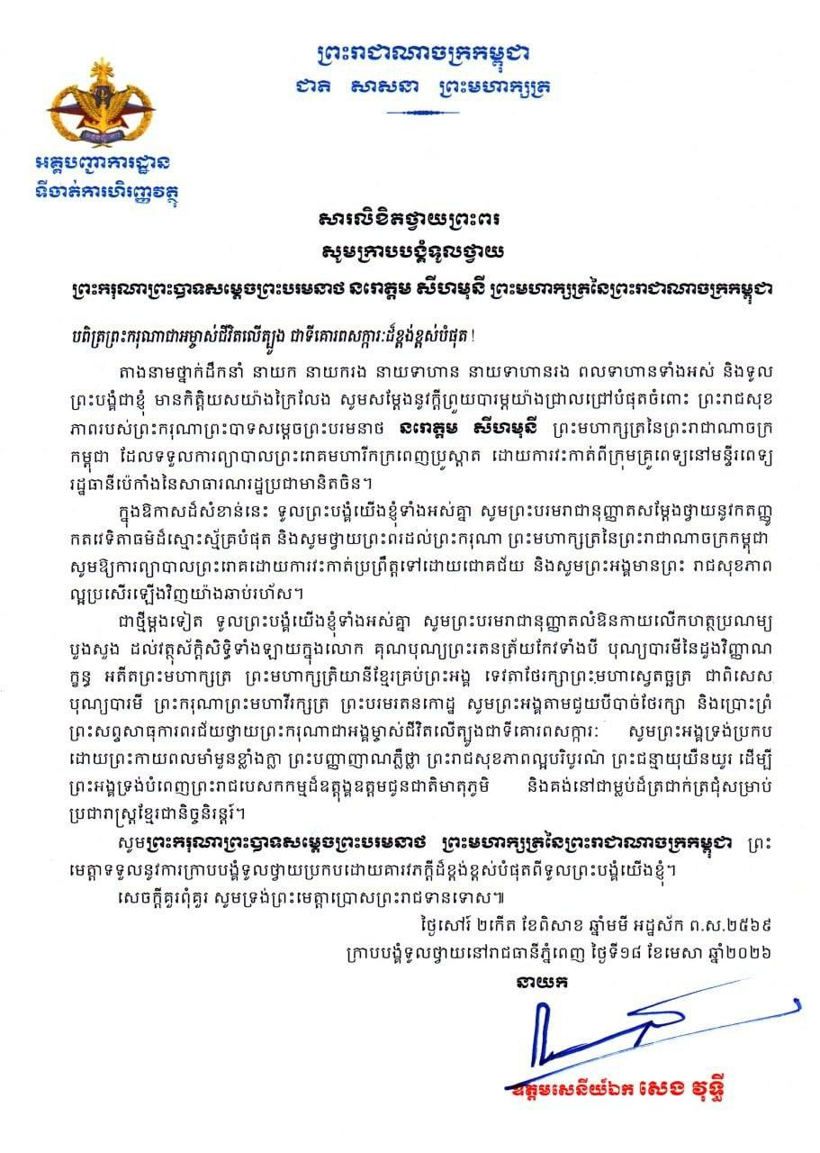 ទូលព្រះបង្គំជាខ្ញុំ សូមសម្តែងនូវក្តីបារម្ភ ក្រោយពីទទួលព័ត៌មានថា ព្រះរោគមហារីកក្រពេញប្រូស្តាត (prostate cancer) របស់ព្រះករុណា ជាអម្ចាស់ជីវិតលើត្បូង ជាទីគោរពសក្ការៈដ៏ខ្ពង់ខ្ពស់បំផុត តម្រូវឱ្យព្រះអង្គទទួលការព្យាបាលដោយការវះកាត់តាមវេជ្ជបញ្ជា នៅមន្ទីរពេទ្យនារដ្ឋធានីប៉េកាំង នៃសាធារណរដ្ឋប្រជាមានិតចិន និងបន្តគង់ប្រថាប់នៅទីនោះមួយរយៈពេល ដើម្បីតាមដានត្រួតពិនិត្យ និងព្យាបាលព្រះរោគ ចាប់ពីថ្ងៃទី១៨ ខែមេសា ឆ្នាំ២០២៦នេះ។