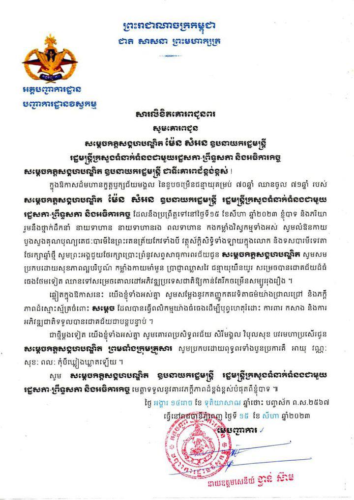 នាយឧត្តមសេនីយ៍ ខ្វាន់ ស៊ាម អគ្គមេបញ្ជាការរង កងយោធពលខេមរភូមិន្ទ មេបញ្ជាការ បញ្ជាការដ្ឋានវិស្វកម្ម អគ្គបញ្ជាការ ព្រមទាំងនាយទាហាន នាយទាហានរង និងពលទាហានទាំងអស់ សូមគោរពជូនពរ សម្តេចកិត្តិសង្គហបណ្ឌិត ម៉ែន សំអន ឧបនាយករដ្ឋមន្រ្ដី រដ្ឋមន្រ្ដីក្រសួងទំនាក់ទំនងជាមួយរដ្ឋសភា-ព្រឹទ្ធសភា និងអធិការកិច្ច ក្នុងឱកាសខួបចម្រើនជន្មាយុគម្រប់ ៧០ ឈានចូល ៧១ឆ្នាំ