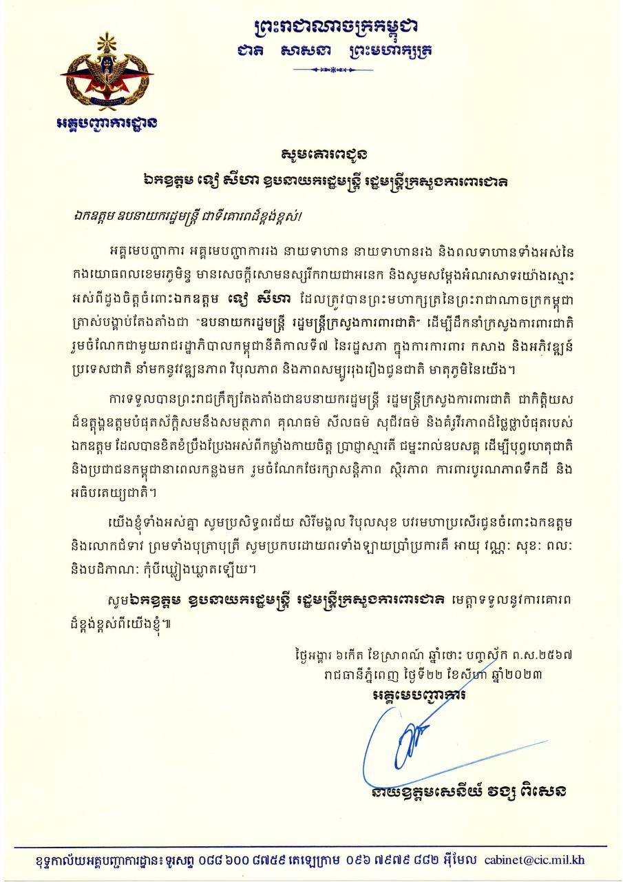 (ភ្នំពេញ)៖ នាយឧត្ដមសេនីយ៍ វង្ស ពិសេន អគ្គមេបញ្ជាការ កងយោធពលខេមរភូមិន្ទ ព្រមទាំងនាយទាហាន នាយទាហានរង និងពលទាហានទាំងអស់នៃកងយោធពលខេមរភូមិន្ទ មានសេចក្តីសោមនស្ស រីករាយជាអនេក និងសូមសម្តែងអំណរសាទរយ៉ាងស្មោះ អស់ពីដួងចិត្ត ចំពោះឯកឧត្តម ទៀ សីហា ដែលត្រូវបានព្រះមហាក្សត្រនៃព្រះរាជាណាចក្រកម្ពុជា ត្រាស់បង្គាប់តែងតាំងជា “ឧបនាយករដ្ឋមន្ត្រី រដ្ឋមន្ត្រីក្រសួងការពារជាតិ” ដើម្បីដឹកនាំក្រសួងការពារជាតិ រួមចំណែកជាមួយរាជរដ្ឋាភិបាលកម្ពុជានីតិកាលទី៧ នៃរដ្ឋសភា ក្នុងការការពារកសាង និងអភិវឌ្ឍន៍ប្រទេសជាតិ នាំមកនូវវឌ្ឍនភាព វិបុលភាព និងភាពសម្បូររុងរឿង ជូនជាតិមាតុភូមិនៃយើង។