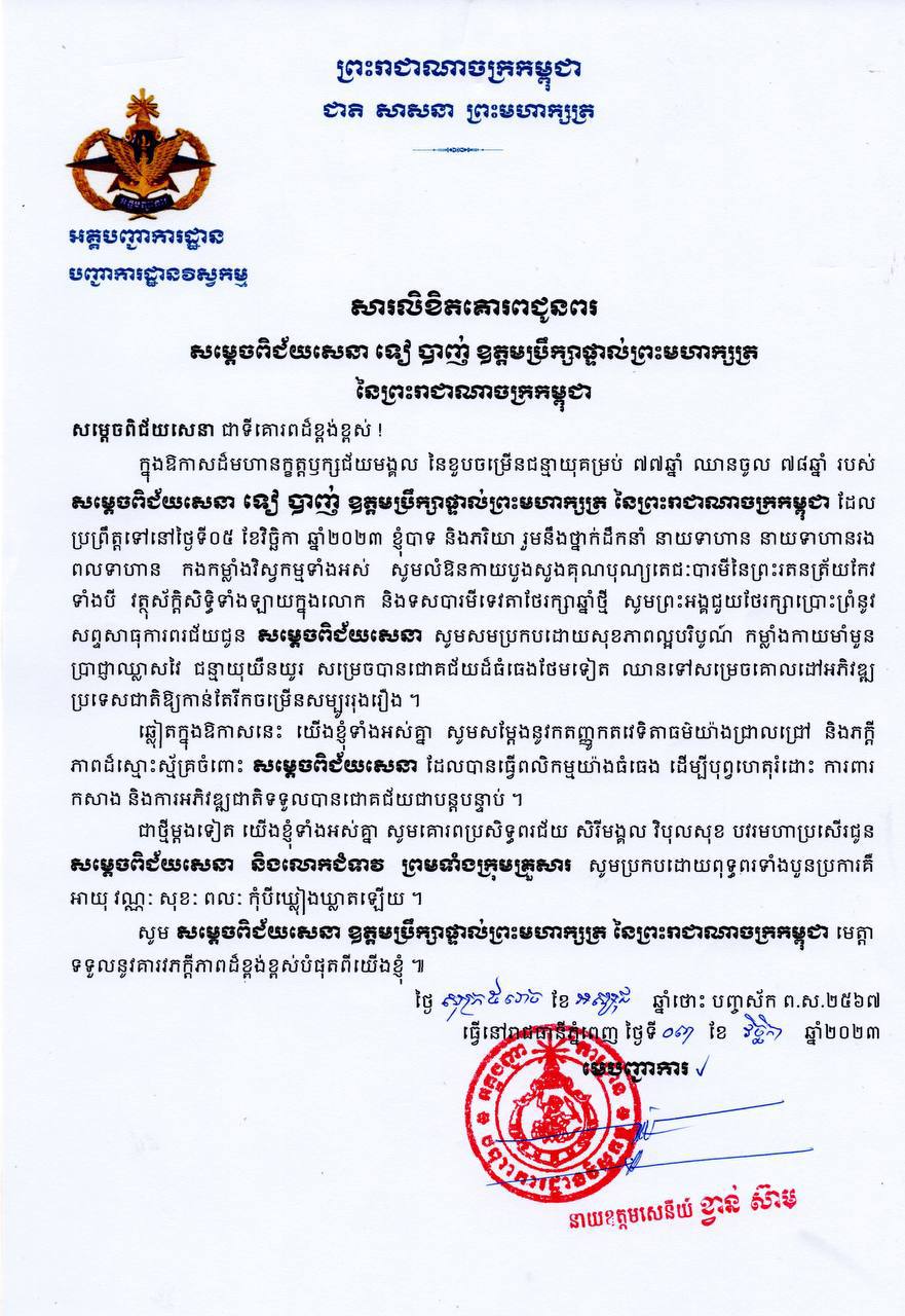 ឯកឧត្ដម នាយឧត្តមសេនីយ៍ ខ្វាន់ ស៊ាម ផ្ញើសារគោរពជូនពរ សម្ដេចពិជ័យសេនា ទៀ បាញ់ ក្នុងឱកាសចម្រើនជន្មាយុគម្រប់៧៧ឆ្នាំ ឈានចូល ៧៨ឆ្នាំ