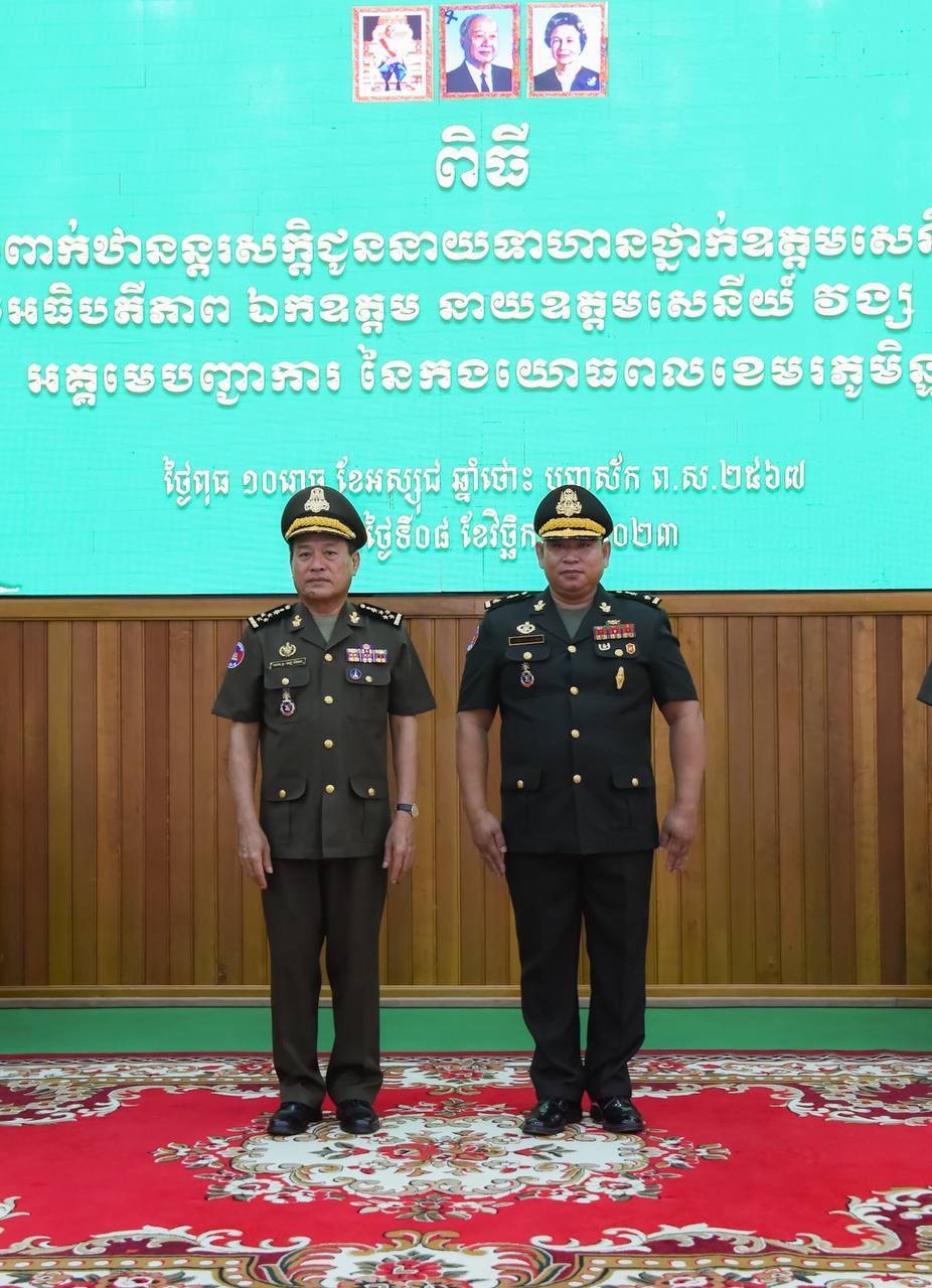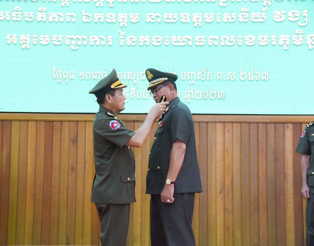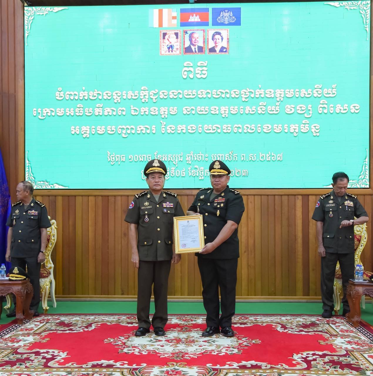 (ភ្នំពេញ)៖ នៅព្រឹកថ្ងៃទី៨ ខែវិច្ឆិកា ឆ្នាំ២០២៣ ឯកឧត្តម នាយឧត្ដមសេនីយ៍ វង្ស ពិសេន អគ្គមេបញ្ជាការ នៃកងយោធពលខេមរភូមិន្ទ បានអញ្ជើញបំពាក់ឋានន្តរសក្តិនាយទាហានជាន់ខ្ពស់បីរូប រួមមាន មេបញ្ជាការបញ្ជាការដ្ឋានជាតិកម្លាំងពិសេសប្រឆាំងភេរវកម្ម មេបញ្ជាការ បញ្ជាការដ្ឋានទ័ពពិសេស និងនាយការិយាល័យទី៣ កងទ័ពជើងគោក។