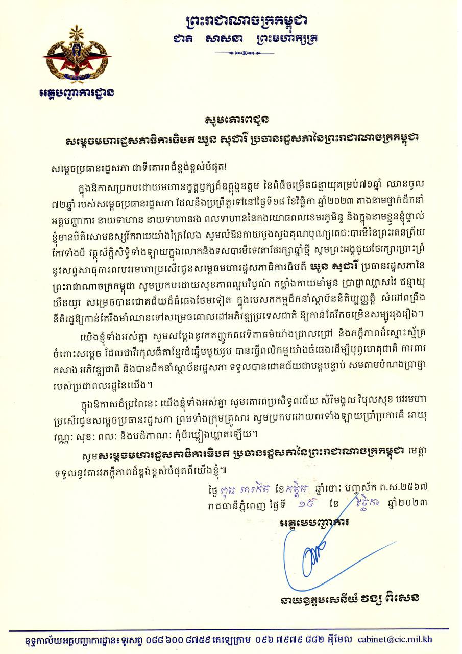 យើងខ្ញុំទាំងអស់គ្នា សូមសម្តែងនូវទឹកចិត្តសោមនស្សរីករាយយ៉ាងក្រៃលែង និងចូលរួមជូននូវសព្ទសាធុការពរជ័យ បវរសួស្ដី សិរីមង្គល វិបុលសុខ មហាប្រសើរគ្រប់ប្រការ ប្រកបដោយមនោសញ្ចេតនាគោរពស្រឡាញ់យ៉ាងជ្រាលជ្រៅបំផុតចំពោះ សម្តេចមហារដ្ឋសភាធិការធិបតី ប្រធានរដ្ឋសភា សូមសមប្រកបដោយបញ្ញាញាណភ្លឺថ្លាឈ្លាសវៃ កាយពលរឹងមាំ សុខភាពល្អបរិបូណ៌ និងជន្មាយុយឺនយូរចាកផុតពីរោគាព្យាធិនានាតរៀងទៅ។