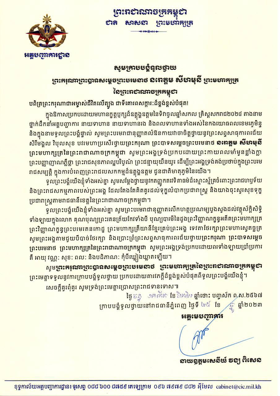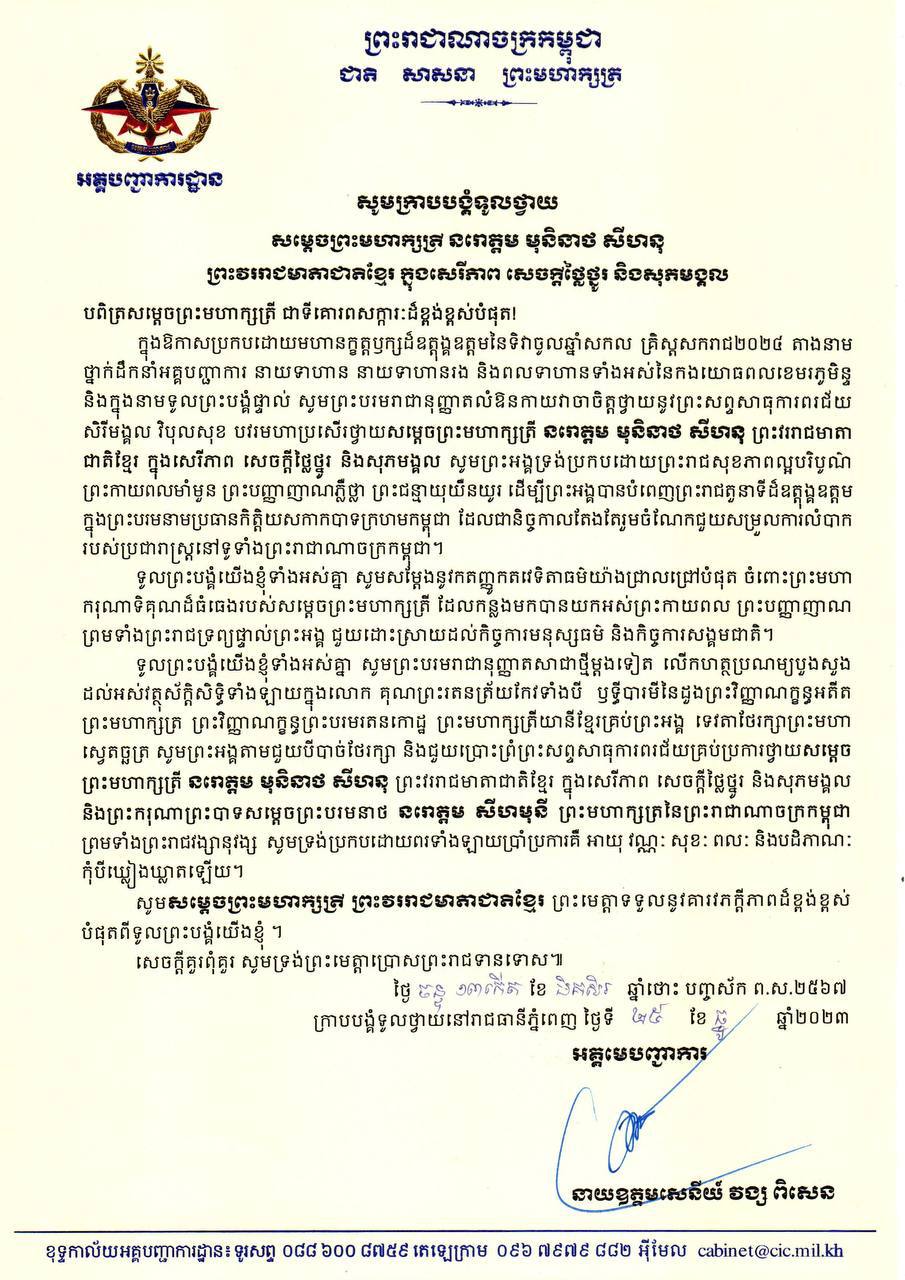 (ភ្នំពេញ)៖ ទូលព្រះបង្គំជាខ្ញុំ វង្ស ពិសេន អគ្គមេបញ្ជាការនៃកងយោធពលខេមរភូមិន្ទ ព្រមទាំងនាយទាហាន នាយទាហានរង និងពលទាហានទាំងអស់នៃកងយោធពលខេមរភូមិន្ទ សូមព្រះបរមរាជានុញ្ញាត ក្រាបបង្គំទូលថ្វាយព្រះពរ ព្រះករុណាព្រះបាទសម្តេចព្រះបរមនាថ នរោត្តម សីហមុនី ព្រះមហាក្សត្រនៃកម្ពុជា និង សម្ដេចព្រះមហាក្សត្រី នរោត្តម មុនិនាថ សីហនុ ព្រះវររាជមាតាជាតិខ្មែរ ជាទីគោរពសក្ការៈដ៏ខ្ពង់ខ្ពស់បំផុត ក្នុងឱកាសចូលឆ្នាំថ្មី ឆ្នាំសកល គ.ស.២០២៤។