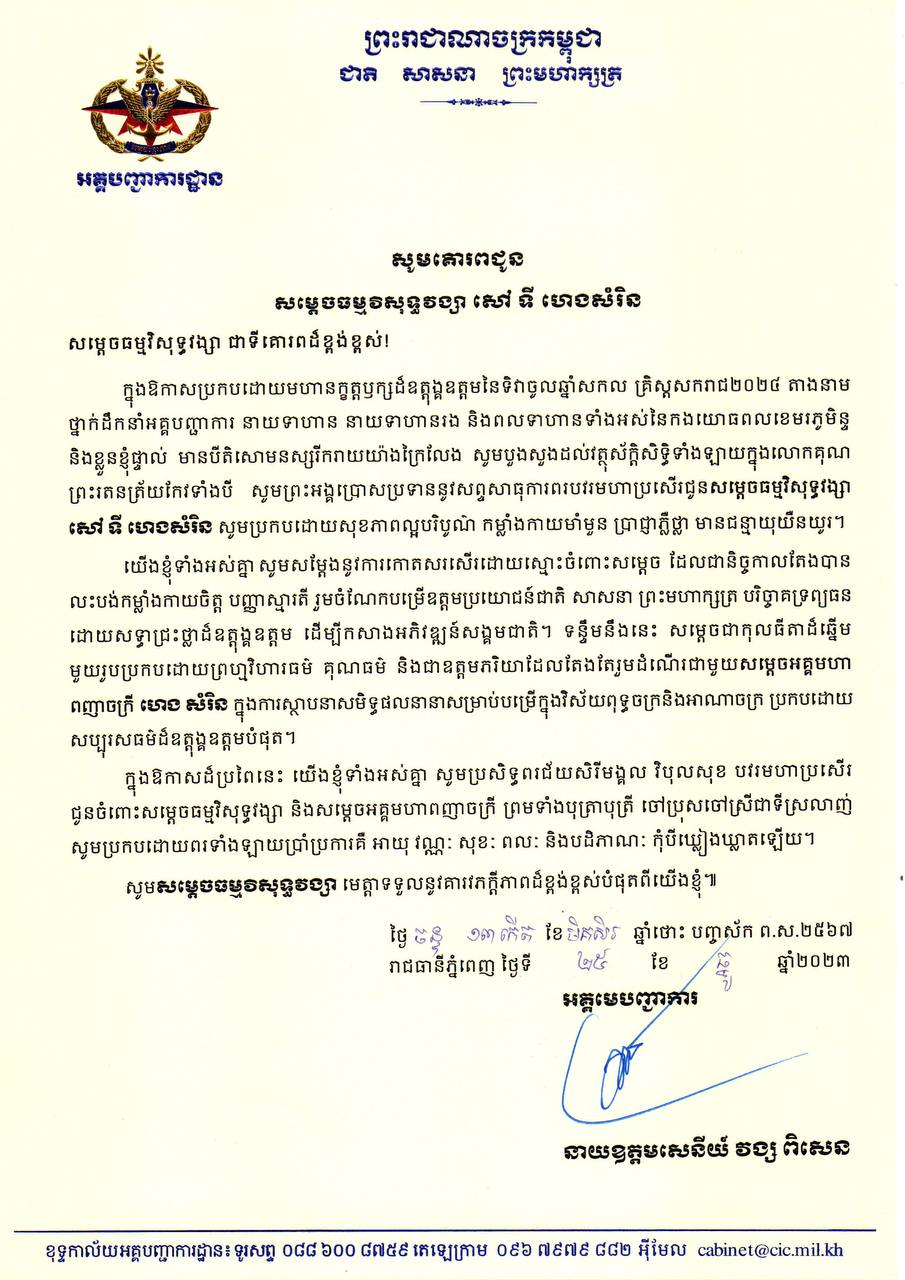 (ភ្នំពេញ)៖ ឯកឧត្ដម នាយឧត្ដមសេនីយ៍ វង្ស ពិសេន អគ្គមេបញ្ជាការនៃកងយោធពលខេមរភូមិន្ទ ព្រមទាំងនាយទាហាន នាយទាហានរង និងពលទាហានទាំងអស់នៃកងយោធពលខេមរភូមិន្ទ បានផ្ញើសារលិខិតគោរពជូនពរ សម្ដេចអគ្គមហាពញាចក្រី ហេង សំរិន ប្រធានកិត្តិយសនៃក្រុមឧត្តមប្រឹក្សាផ្ទាល់ ព្រះមហាក្សត្រនៃព្រះរាជាណាចក្រកម្ពុជា និងសម្ដេចធម្មវិសុទ្ធវង្សា សៅទី ហេង សំរិន ក្នុងឱកាសចូលឆ្នាំថ្មី ឆ្នាំសកល គ.ស.២០២៤។