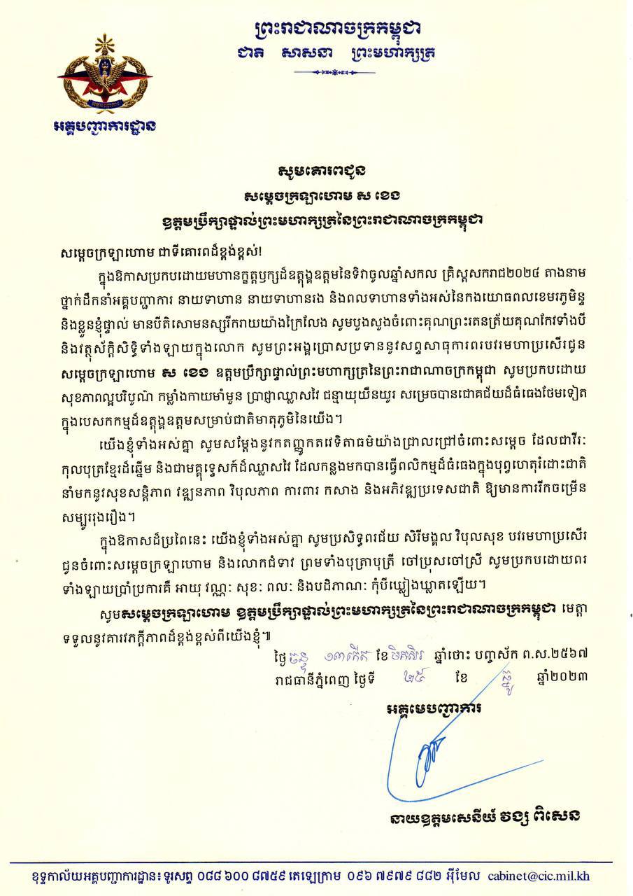 (ភ្នំពេញ)៖ ឯកឧត្ដម នាយឧត្ដមសេនីយ៍ វង្ស ពិសេន អគ្គមេបញ្ជាការនៃកងយោធពលខេមរភូមិន្ទ ព្រមទាំងនាយទាហាន នាយទាហានរង និងពលទាហានទាំងអស់នៃកងយោធពលខេមរភូមិន្ទ បានផ្ញើសារលិខិតគោរពជូនពរ សម្ដេចក្រឡាហោម ស ខេង ឧត្តមប្រឹក្សាផ្ទាល់ព្រះមហាក្សត្រនៃព្រះរាជាណាចក្រកម្ពុជា និងលោកជំទាវ ក្នុងឱកាសចូលឆ្នាំថ្មី ឆ្នាំសកល គ.ស.២០២៤។