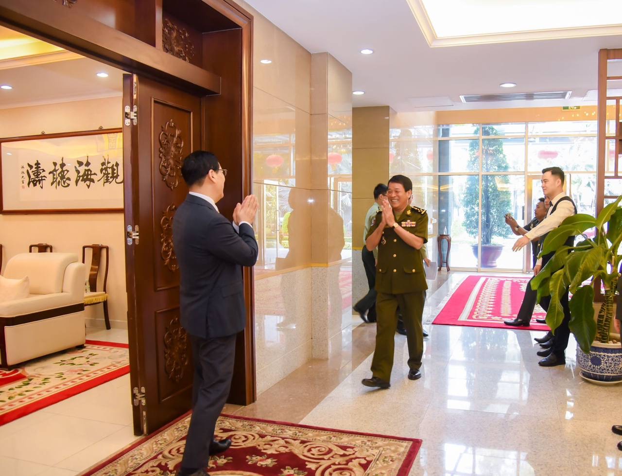 (ភ្នំពេញ)៖ នៅព្រឹកថ្ងៃទី០១ ខែមករា ឆ្នាំ២០២៤ ឯកឧត្តម នាយឧត្តមសេនីយ៍ វង្ស ពិសេន អគ្គមេបញ្ជាការ នៃកងយោធពលខេមរភូមិន្ទ បានដឹកនាំប្រតិភូជូនពរ ឯកឧត្តម វ៉ាង វិនធាន ឯកអគ្គរដ្ឋទូតចិន និង វរសេនីយ៍ឯកពិសេស តាំង ហាវ ប្រធានការិយាល័យអនុព័ន្ធយោធាចិនប្រចាំកម្ពុជា ក្នុងឱកាសត្រៀមអំណរសាទរពិធីបុណ្យចូលឆ្នាំថ្មីប្រពៃណីចិននាពេលខាងមុខ។