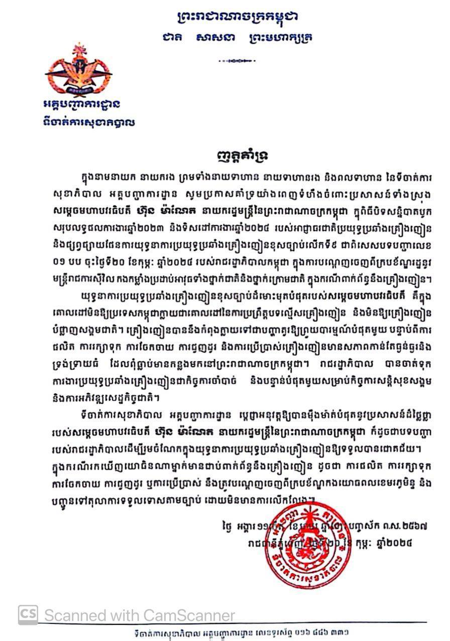 (ភ្នំពេញ)៖ ឧត្ដមសេនីយ៍ទោ ញ៉ែម សុខ័ន្ធី នាយកទីចាត់ការសុខាភិបាល អគ្គបញ្ជាការ ព្រមទាំងនាយទាហាន នាយទាហានរង និងពលទាហានទាំងអស់ សូមសម្តែងនូវការគាំទ្រយ៉ាងពេញទំហឹង ចំពោះវិធានការដ៏ម៉ឺងម៉ាត់ និងមុតស្រួចរបស់ សម្តេចមហាបវរធិបតី ហ៊ុន ម៉ាណែត នាយករដ្ឋមន្រ្តីនៃព្រះរាជាណាចក្រកម្ពុជា ក្នុងការប្រយុទ្ធប្រឆាំងគ្រឿងញៀន តាមក្រសួងស្ថាប័ន និងរដ្ឋបាលថ្នាក់ក្រោមជាតិ ហើយបើរកឃើញមានមន្រ្តីណា មានសារធាតុញាណក្នុងខ្លួន នឹងត្រូវបណ្តេញចេញពីក្របខណ្ឌ ដោយគ្មានការលើកលែង។