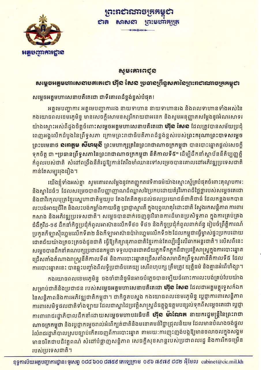 យើងខ្ញុំទាំងអស់គ្នា សូមសម្តែងនូវការគោរពដឹងគុណយ៉ាងជ្រាលជ្រៅបំផុត ចំពោះសម្តេចតេជោ ដែលបានយកអស់កម្លាំងកាយចិត្ត ប្រាជ្ញាស្មារតី តស៊ូរំដោះប្រទេសជាតិ និងប្រជាជនពីរបបប្រល័យពូជសាសន៍ និងបន្តចូលរួមចំណែកក្នុងការស្តារ និងកសាងប្រទេស ការពារខឿនឯករាជ្យជាតិ បូរណភាពទឹកដី នាំមកនូវសុខសន្តិភាព សុខដុមរមនីយភាព ជូនប្រជាជនកម្ពុជាទូទាំងប្រទេស។