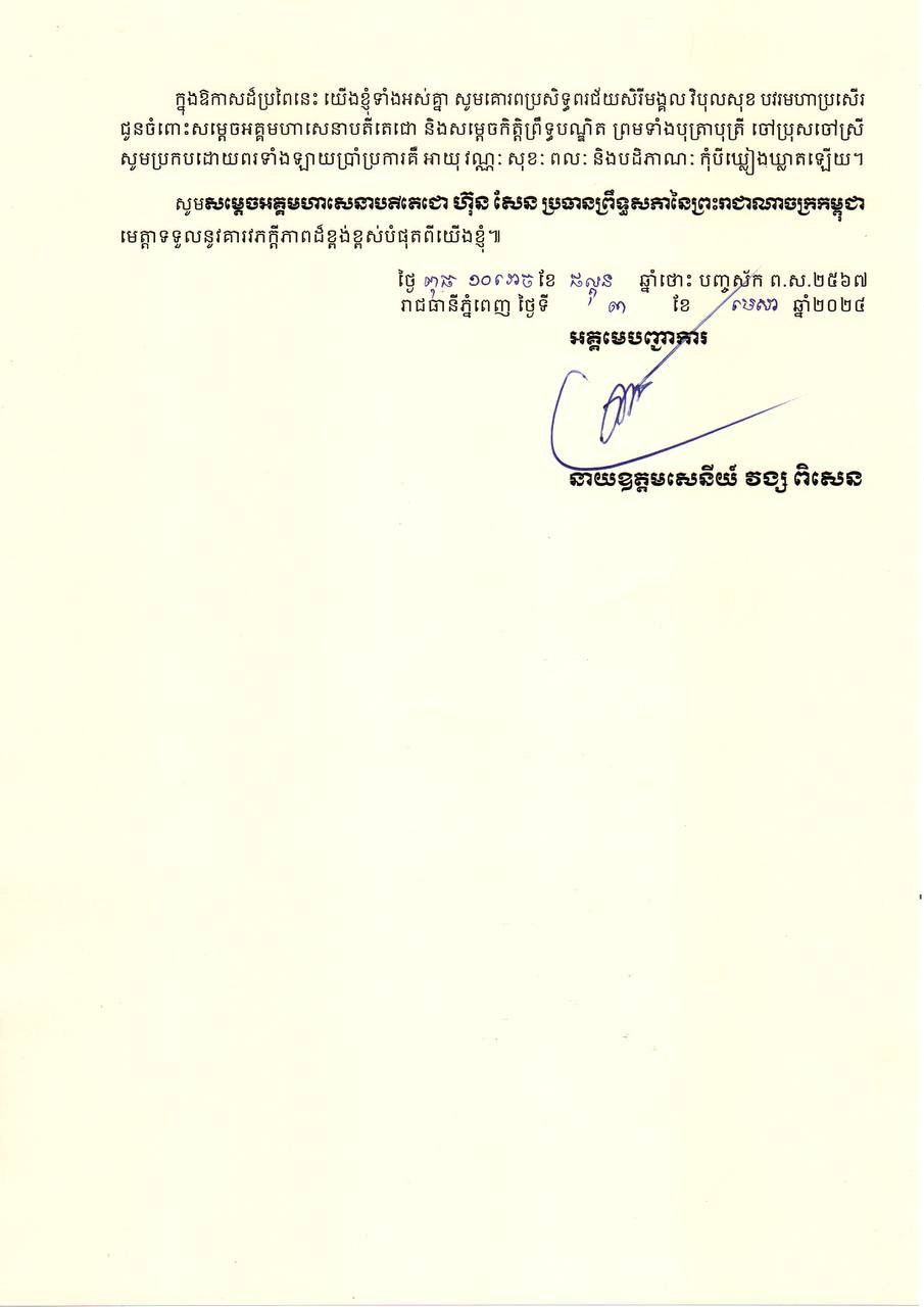ក្នុងឱកាសដ៏មហោឡារិកនេះ យើងខ្ញុំទាំងអស់គ្នាសូមបួងសួងដល់គុណបុណ្យ ព្រះរតនត្រ័យ កែវទាំងបី វត្ថុស័ក្ដិសិទ្ធិក្នុងលោក និងទេវតាឆ្នាំថ្មី សូមប្រោះព្រំសព្ទសាធុការពរ សិរីសួស្ដី ជ័យមង្គលវិបុលសុខ បវរមហាប្រសើរថ្លៃថ្លា ជូនចំពោះសម្ដេចតេជោ និងសម្ដេចកិត្តិព្រឹទ្ធបណ្ឌិត ព្រមទាំងបុត្រាបុត្រី និងចៅៗទាំងអស់ សូមមានសុខភាពល្អបរិបូរណ៍ កម្លាំងពលំមាំមួន ប្រាជ្ញាភ្លឺថ្លា ជន្មាយុយឺនយូរ ឈ្នះអស់មារសត្រូវគ្រប់ទិសទី និងទទួលបានជោគជ័យថ្មីបន្ថែមទៀត ក្នុងបុព្វហេតុជាតិ មាតុភូមិ ប្រជាជន ប្រកបដោយការអភិវឌ្ឍ និងរីកចម្រើនតរៀងទៅ និងសូមបានប្រកប ដោយពុទ្ធពរទាំងបួនប្រការ គឺ អាយុ វណ្ណៈ សុខៈ ពលៈ កុំបីឃ្លៀងឃ្លាតឡើយ៕