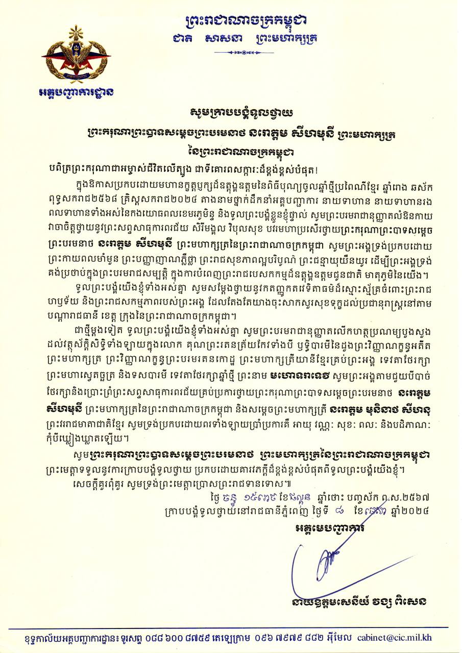 (ភ្នំពេញ)៖ ទូលព្រះបង្គំជាខ្ញុំ វង្ស ពិសេន សូមក្រាបបង្គំទូលថ្វាយព្រះពរ ព្រះករុណាជាអម្ចាស់ជីវិតលើត្បូង និងព្រះវររាជមាតាជាតិខ្មែរ ក្នុងឱកាសបុណ្យចូលឆ្នាំថ្មី ឆ្នាំរោង អគ្គមេបញ្ជាការ កងយោធពលខេមរភូមិន្ទ ព្រមទាំងនាយទាហាន នាយទាហានរង និងពលទាហានទាំងអស់នៃកងយោធពលខេមរភូមិន្ទ សូមព្រះបរមរាជានុញ្ញាត ក្រាបបង្គំទូលថ្វាយព្រះពរ ព្រះករុណាព្រះបាទសម្តេចព្រះបរមនាថ នរោត្តម សីហមុនី ព្រះមហាក្សត្រនៃកម្ពុជា និង សម្ដេចព្រះមហាក្សត្រី នរោត្តម មុនិនាថ សីហនុ ព្រះវររាជមាតាជាតិខ្មែរ ជាទីគោរពសក្ការៈដ៏ខ្ពង់ខ្ពស់បំផុត ក្នុងឱកាសពិធីបុណ្យចូលឆ្នាំថ្មី ប្រពៃណីជាតិខ្មែរ ឆ្នាំរោង ឆស័ក។