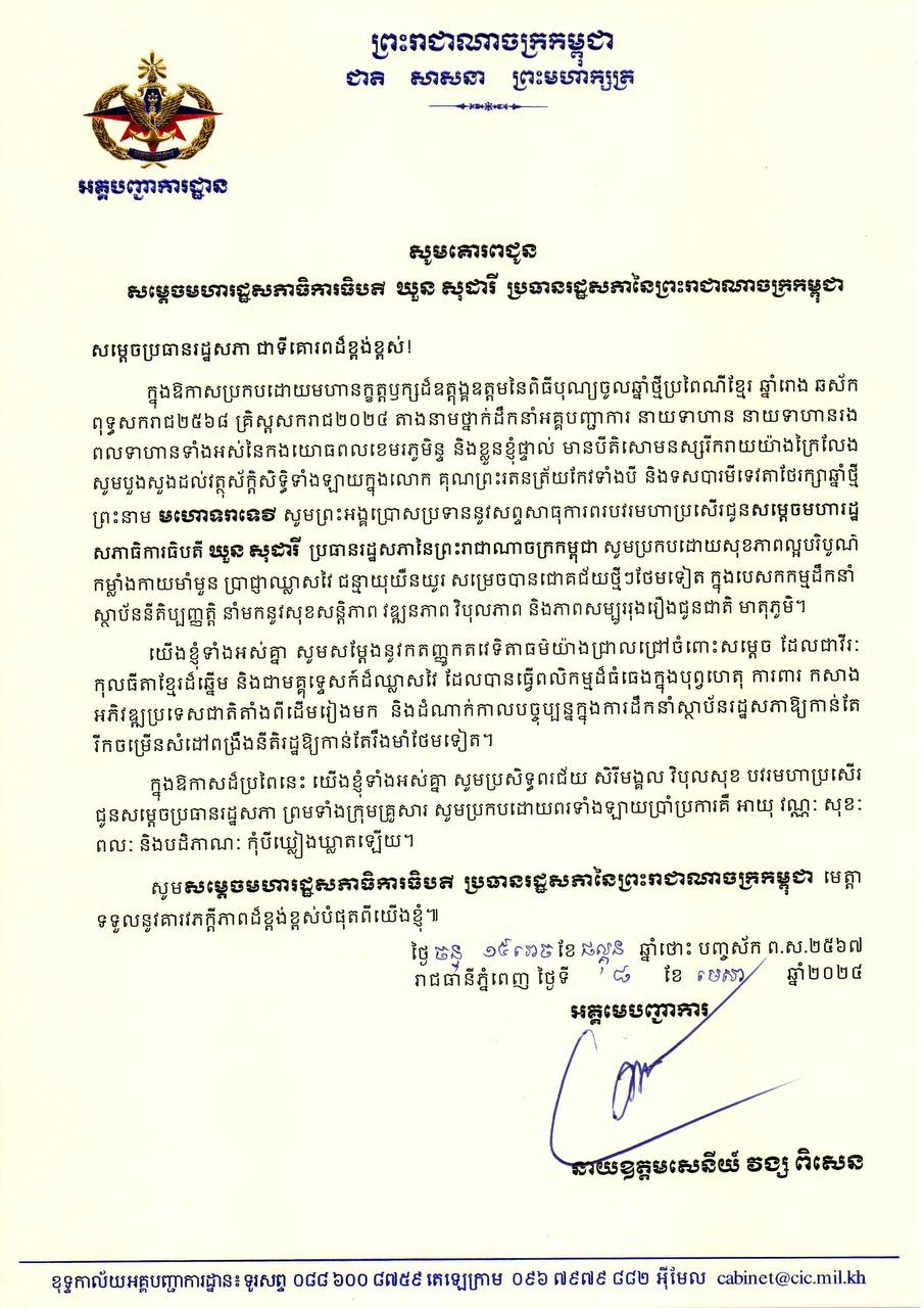 (ភ្នំពេញ)៖ ឯកឧត្ដម នាយឧត្តមសេនីយ៍ វង្ស ពិសេន អគ្គមេបញ្ជាការ កងយោធពលខេមរភូមិន្ទ ព្រមទាំងនាយទាហាន នាយទាហានរង និងពលទាហានទាំងអស់ នៃកងយោធពលខេមរភូមិន្ទ សូមផ្ញើសារលិខិតគោរពជូនពរ សម្តេចមហារដ្ឋសភាធិការធិបតី ឃួន សុដារី ប្រធានរដ្ឋសភានៃព្រះរាជាណាចក្រកម្ពុជាក្នុងឱកាសពិធីបុណ្យចូលឆ្នាំថ្មី ប្រពៃណីជាតិខ្មែរ ឆ្នាំរោង ឆស័ក។