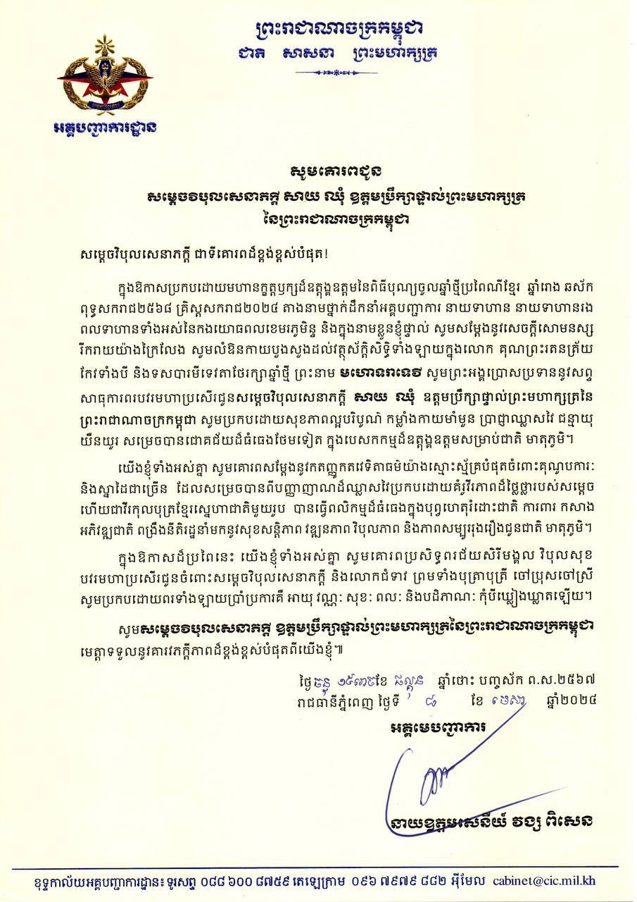 (ភ្នំពេញ)៖ ឯកឧត្ដម នាយឧត្តមសេនីយ៍ វង្ស ពិសេន អគ្គមេបញ្ជាការ កងយោធពលខេមរភូមិន្ទ ព្រមទាំងនាយទាហាន នាយទាហានរង និងពលទាហានទាំងអស់ នៃកងយោធពលខេមរភូមិន្ទ សូមផ្ញើសារលិខិតគោរពជូនពរ សម្តេចវិបុលសេនាភក្ដី សាយ ឈុំ ឧត្ដមប្រឹក្សាផ្ទាល់ព្រះមហាក្សត្រនៃព្រះរាជាណាចក្រកម្ពុជា ក្នុងឱកាសពិធីបុណ្យចូលឆ្នាំថ្មី ប្រពៃណីជាតិខ្មែរ ឆ្នាំរោង ឆស័ក។
