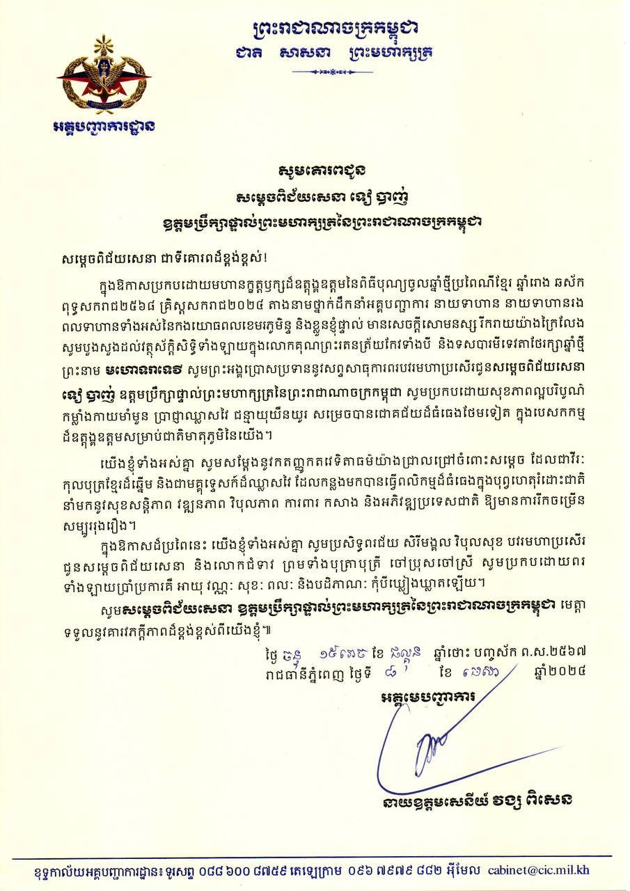 (ភ្នំពេញ)៖ ឯកឧត្ដម នាយឧត្តមសេនីយ៍ វង្ស ពិសេន អគ្គមេបញ្ជាការ កងយោធពលខេមរភូមិន្ទ ព្រមទាំងនាយទាហាន នាយទាហានរង និងពលទាហានទាំងអស់ នៃកងយោធពលខេមរភូមិន្ទ សូមផ្ញើសារលិខិតគោរពជូនពរសម្ដេចពិជ័យសេនា ទៀ បាញ់ ឧត្ដមប្រឹក្សាផ្ទាល់ព្រះមហាក្សត្រនៃព្រះរាជាណាចក្រកម្ពុជា ក្នុងឱកាសពិធីបុណ្យចូលឆ្នាំថ្មី ប្រពៃណីជាតិខ្មែរ ឆ្នាំរោង ឆស័ក។