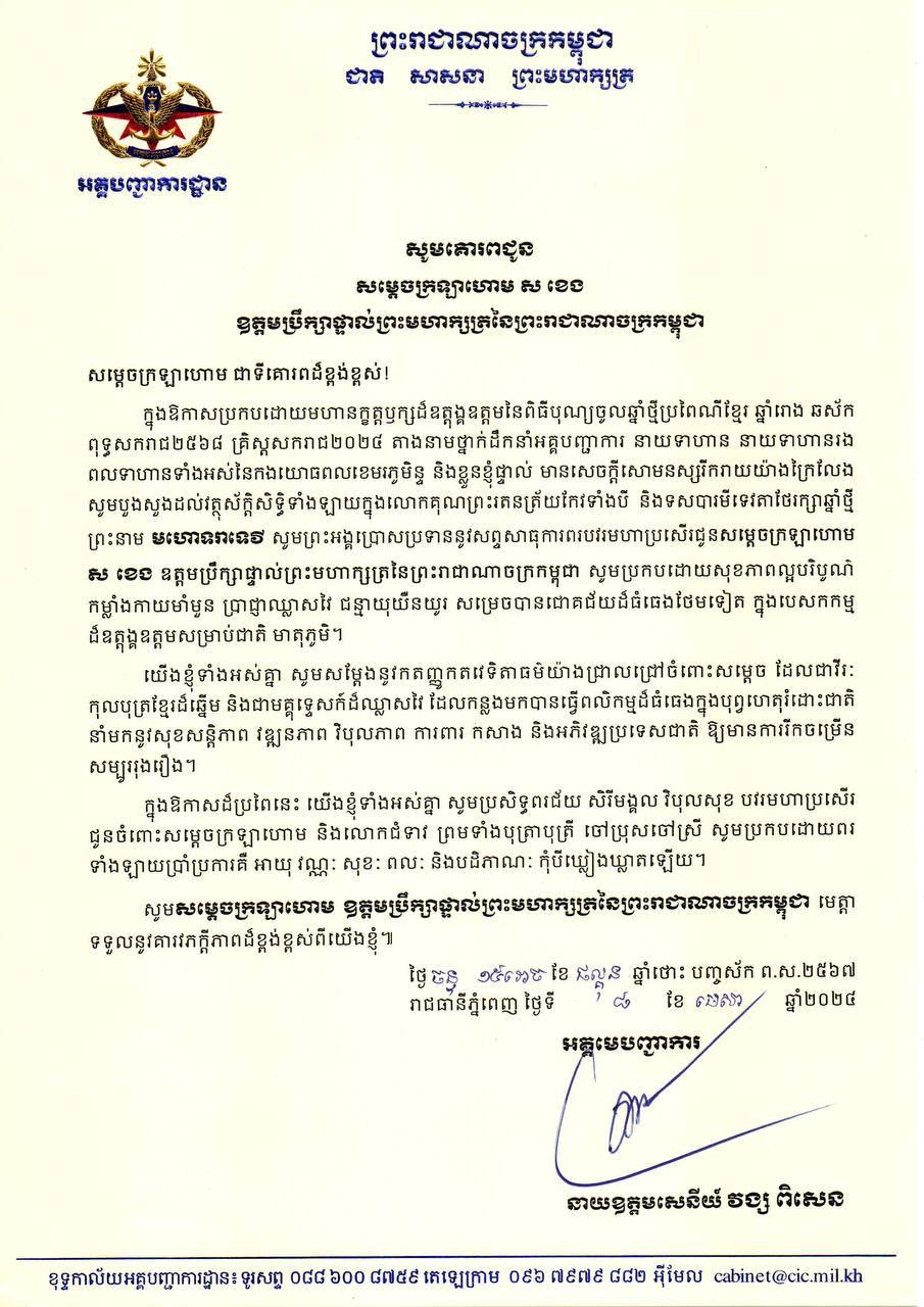 (ភ្នំពេញ)៖ ឯកឧត្ដម នាយឧត្តមសេនីយ៍ វង្ស ពិសេន អគ្គមេបញ្ជាការ កងយោធពលខេមរភូមិន្ទ ព្រមទាំងនាយទាហាន នាយទាហានរង និងពលទាហានទាំងអស់ នៃកងយោធពលខេមរភូមិន្ទ សូមផ្ញើសារលិខិតគោរពជូនពរសម្ដេចក្រឡាហោម ស ខេង ឧត្ដមប្រឹក្សាផ្ទាល់ព្រះមហាក្សត្រនៃព្រះរាជាណាចក្រកម្ពុជា ក្នុងឱកាសពិធីបុណ្យចូលឆ្នាំថ្មី ប្រពៃណីជាតិខ្មែរ ឆ្នាំរោង ឆស័ក។