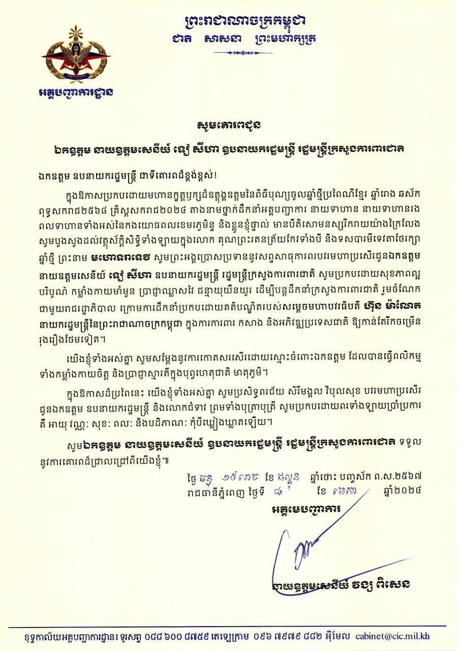 (ភ្នំពេញ)៖ ឯកឧត្ដម នាយឧត្តមសេនីយ៍ វង្ស ពិសេន អគ្គមេបញ្ជាការ កងយោធពលខេមរភូមិន្ទ ព្រមទាំងនាយទាហាន នាយទាហានរង និងពលទាហានទាំងអស់នៃកងយោធពលខេមរភូមិន្ទ សូមផ្ញើសារលិខិតគោរពជូនពរឯកឧត្ដម នាយឧត្ដមសេនីយ៍ ទៀ សីហា ឧបនាយករដ្ឋមន្ត្រី រដ្ឋមន្ត្រីក្រសួងការពារជាតិ ក្នុងឱកាសពិធីបុណ្យចូលឆ្នាំថ្មី ប្រពៃណីជាតិខ្មែរ ឆ្នាំរោង ឆស័ក។