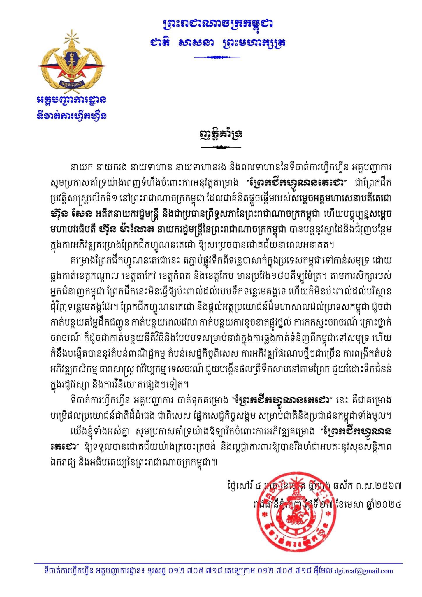 (ភ្នំពេញ)៖ ឯកឧត្តម ឧត្ដមសេនីយ៍ទោ ប៉ែន សុក្រិត្យវិទ្យា នាយកទីចាត់ការហ្វឹកហ្វឺន អគ្គបញ្ជាការ ព្រមទាំងនាយទាហាន នាយទាហានរង និងពលទាហានទាំងអស់ សូមប្រកាសគាំទ្រយ៉ាងពេញទំហឹង ចំពោះការអនុវត្តគម្រោងព្រែកជីកហ្វូណន–តេជោ ដែលជាព្រែកជីកប្រវត្តិសាស្ត្រលើកទី១នៅកម្ពុជា ដែលជាគំនិតផ្តួចផ្តើមរបស់ សម្តេចអគ្គមហាសេនាបតីតេជោ ហ៊ុន សែន អតីតនាយករដ្ឋមន្ត្រី និងជាប្រធាន ព្រឹទ្ធសភានៃព្រះរាជាណាចក្រកម្ពុជា ហើយបច្ចុប្បន្នសម្តេចមហាបវរធិបតី ហ៊ុន ម៉ាណែត នាយករដ្ឋមន្ត្រីនៃព្រះរាជាណាចក្រកម្ពុជា បានបន្តស្នាដៃ និងជំរុញបន្ថែមក្នុងការអភិវឌ្ឍគម្រោង ព្រែកជីកហ្វូណន–តេជោ ឲ្យសម្រេចបាននាពេលអនាគត។