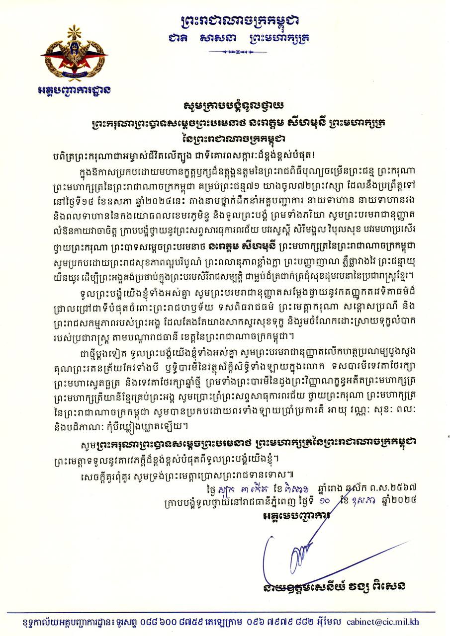 នៅក្នុងឱកាសដ៏មហាមង្គលាភិរម្យថ្លៃថ្លា ប្រកបដោយក្តីសោមនស្សរីករាយបំផុត នៃព្រះរាជពិធីបុណ្យចម្រើនព្រះជន្មវស្សារបស់ ព្រះករុណាព្រះបាទសម្តេច ព្រះបរមនាថ នរោត្តម សីហមុនី ព្រះមហាក្សត្រនៃព្រះរាជាណាចក្រកម្ពុជា គម្រប់ ៧១ព្រះវស្សា យាងចូល៧២ព្រះវស្សា ដែលប្រព្រឹត្តទៅនៅថ្ងៃអង្គារ ៧កើត ខែពិសាខ ឆ្នាំរោង ឆស័ក ព.ស. ២៥៦៧ ត្រូវនឹងថ្ងៃទី១៤ ខែឧសភា ឆ្នាំ២០២៤ ទូលព្រះបង្គំយើងខ្ញុំ សូមលំឱនកាយវាចាចិត្តក្រាបបង្គំទូលថ្វាយ នូវព្រះសព្ទសាធុការពរជ័យ បវរសួស្តី សិរីមង្គល វិបុលសុខ មហាប្រសើរគ្រប់ប្រការ ថ្វាយព្រះករុណាជាអម្ចាស់ជីវិតលើត្បូង ជាទីគោរពសក្ការៈដ៏ខ្ពស់ខ្ពស់បំផុត សូមព្រះអង្គ ទ្រង់ប្រកបដោយព្រះរាជសុខភាពល្អបរិបូរណ៍ ព្រះកាយពលរឹងមាំខ្លាំងក្លា ព្រះបញ្ញាញាណ ភ្លឺថ្លាត្រចះត្រចង់ព្រះជន្មាយុយឺនយូរជាងរយព្រះវស្សា ដើម្បីគង់ប្រថាប់ជាម្លប់ដ៏ត្រជាក់ត្រជុំ ដល់ប្រជារាស្ត្រខ្មែរទូទាំងព្រះរាជាណាចក្រកម្ពុជា។