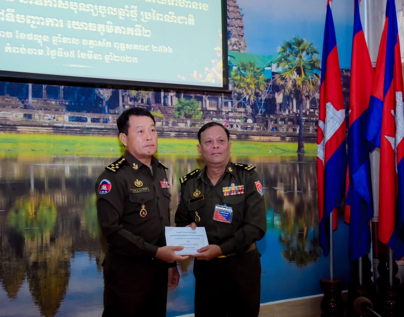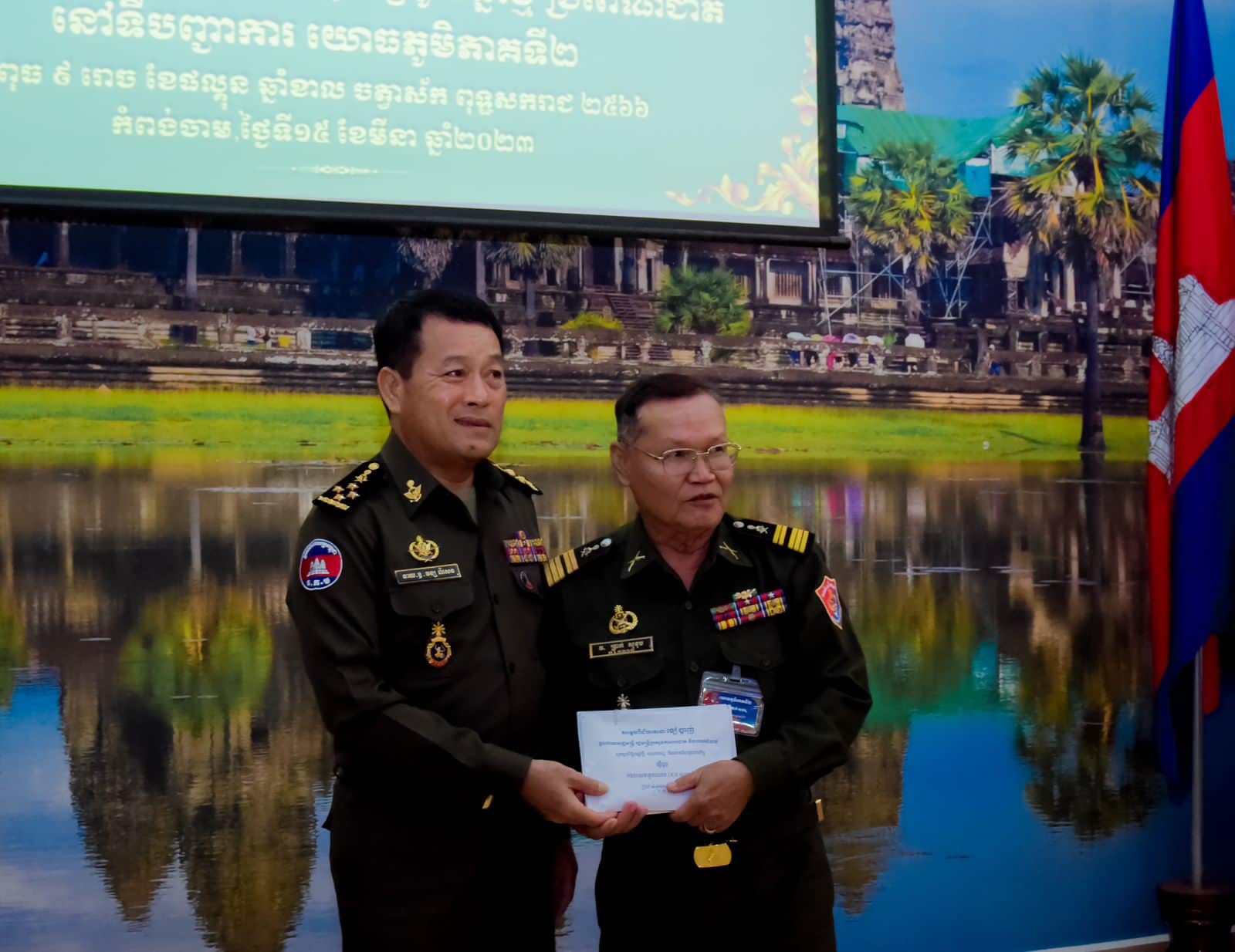 (កំពង់ចាម)៖ នៅព្រឹកថ្ងៃទី១៥ ខែមីនា ឆ្នាំ២០២៣ នាយឧត្តមសេនីយ៍ វង្ស ពិសេន អគ្គមេបញ្ជាការកងយោធពលខេមរភូមិន្ទ បានអញ្ជើញចុះជួបសំណេះសំណាល និងនាំយកថវិកាមួយចំនួន ជាអំណោយឧបត្ថម្ភរបស់សម្ដេចពិជ័យសេនាទៀ បាញ់ ឧបនាយករដ្ឋមន្ត្រី រដ្ឋមន្ត្រីក្រសួងការពារជាតិ ទៅចែកដល់កងកម្លាំងគ្រប់ប្រភេទ នៅទិសយោធភូមិភាគទី២ អបអរពិធីបុណ្យចូលឆ្នាំថ្មីប្រពៃណីជាតិខ្មែរ។