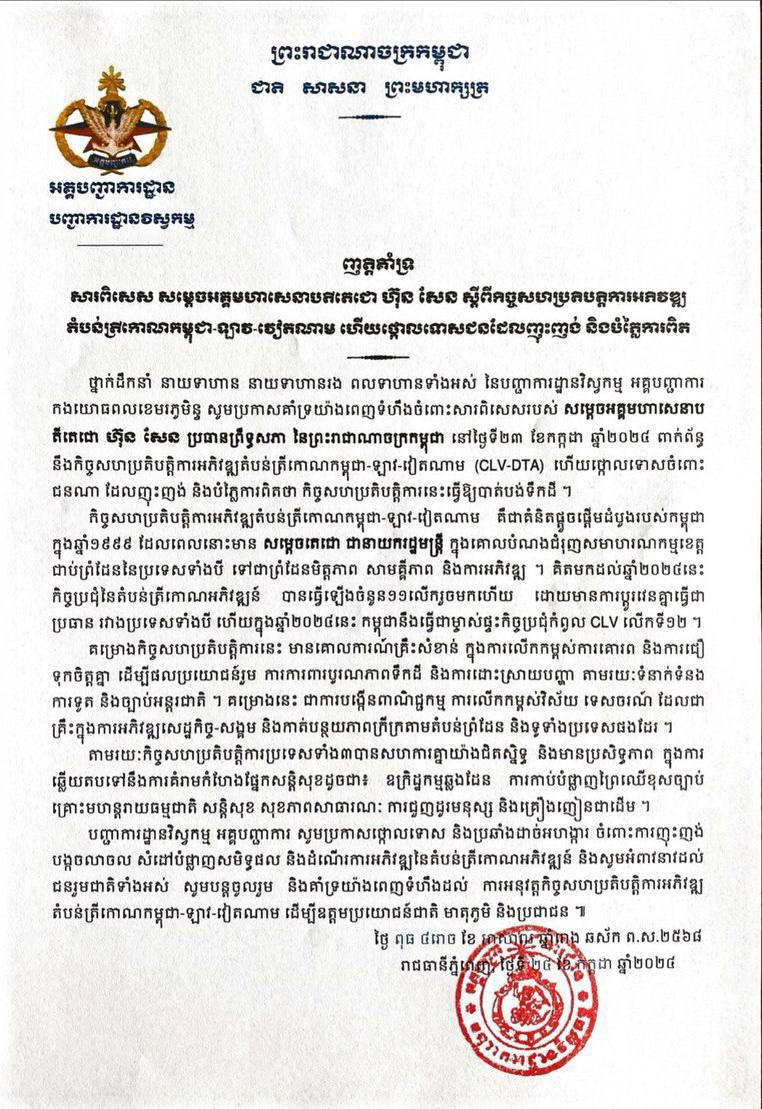 (ភ្នំពេញ)៖ ឯកឧត្ដម នាយឧត្តមសេនីយ៍ ខ្វាន់ ស៊ាម អគ្គមេបញ្ជាការរងនៃកងយោធពលខេមរភូមិន្ទ មេបញ្ជាការ បញ្ជាការដ្ឋានវិស្វកម្ម ព្រមទាំងនាយទាហាន នាយទាហានរង និងពលទាហានទាំងអស់ សូមប្រកាសគាំទ្រយ៉ាងពេញទំហឹងចំពោះសារពិសេសរបស់ សម្តេចតេជោ ហ៊ុន សែន ប្រធានព្រឹទ្ធសភា នៅថ្ងៃទី២៣ ខែកក្កដា ឆ្នាំ២០២៤នេះ ពាក់ព័ន្ធនឹងកិច្ចសហប្រតិបត្តិការអភិវឌ្ឍតំបន់ត្រីកោណកម្ពុជា–ឡាវ–វៀតណាម (CLV-DTA) ហើយថ្កោលទោសចំពោះជនណា ដែលញុះញង់ និងបំភ្លៃការពិតថា កិច្ចសហប្រតិបត្តិការនេះធ្វើឱ្យបាត់បង់ទឹកដី។