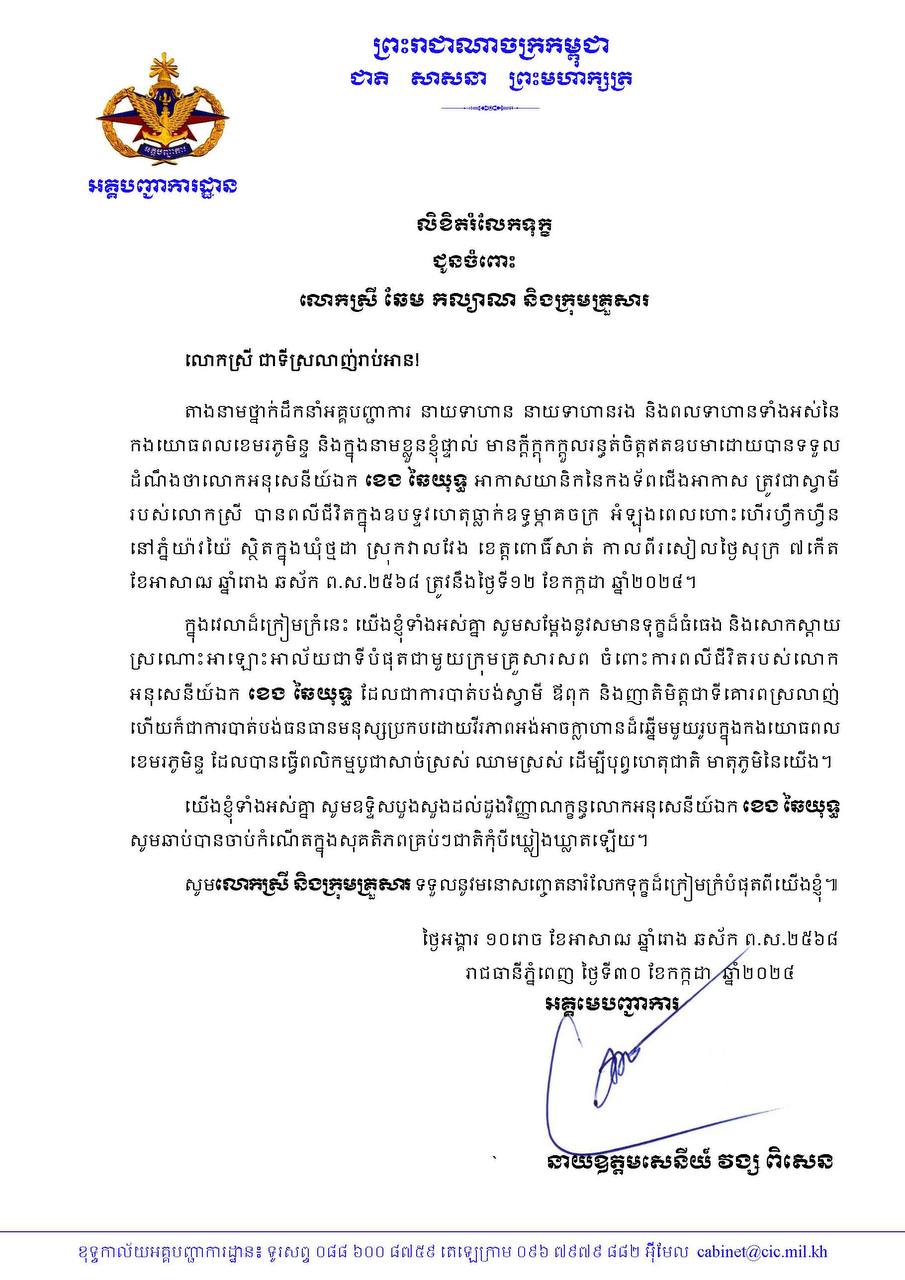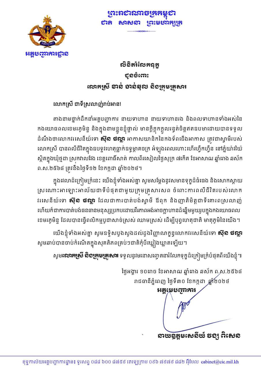 (ភ្នំពេញ)៖ នាយឧត្តមសេនីយ៍ វង្ស ពិសេន អគ្គមេបញ្ជាការ នៃកងយោធពលខេមរភូមិន្ទ ព្រមទាំងនាយទាហាន នាយទាហានរង និងពលទាហានទាំងអស់ នៃកងយោធពលខេមរភូមិន្ទ បានផ្ញើសារចូលរួមរំលែកមរណទុក្ខ យ៉ាងក្រៀមក្រំបំផុត និងមានការសោកស្ដាយយ៉ាងក្រៃលែងជូនក្រុមគ្រួសារសពលោកវរសេនីយ៍ទោ ស៊ុន ផល្លា និងសពលោកអនុសេនីយ៍ឯក ខេង ឆៃយុទ្ធ ជាអាកាសយានិកនៃកងទ័ពជើងអាកាស ដែលពលីក្នុងឧបទ្ទវហេតុ ធ្លាក់ឧទ្ធម្ភាគចក្រ នៅចំណុចលើខ្នងភ្នំយ៉ាវយ៉ៃ ស្ថិតនៅក្នុងឃុំថ្មដា ស្រុកវាលវែង ខេត្តពោធិ៍សាត់។