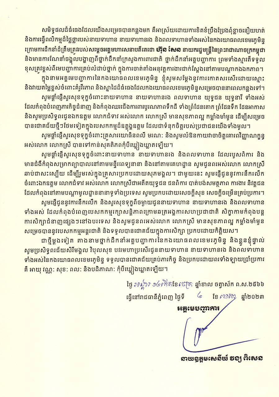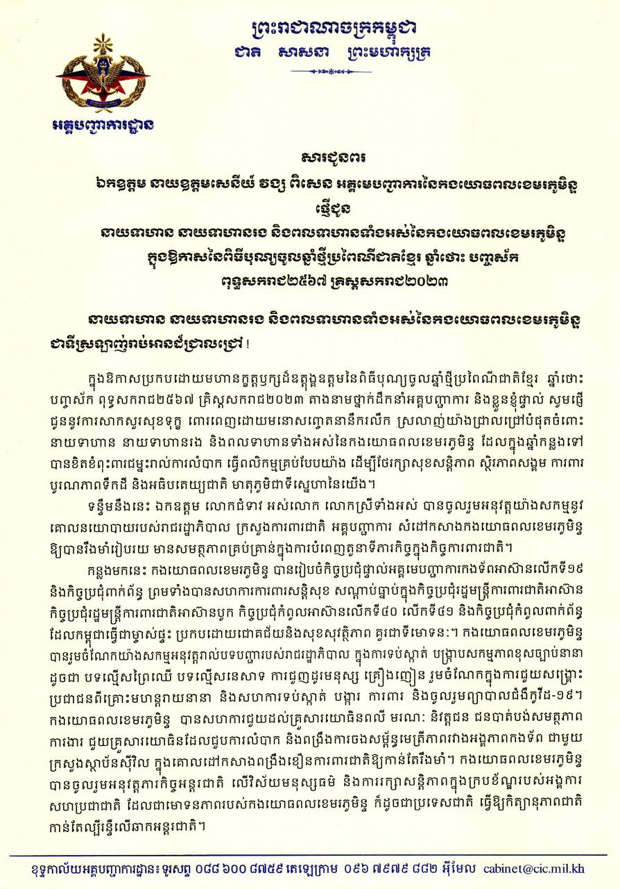 (ភ្នំពេញ)៖ នាយឧត្តមសេនីយ៍ វង្ស ពិសេន អគ្គមេបញ្ជាការនៃកងយោធពលខេមរភូមិន្ទ ផ្ញើជូននាយទាហាន នាយទាហានរង និងពលទាហានទាំងអស់នកងយោធពលខេមរភូមិន្ទ ក្នុងឱកាសនៃពិធីបុណ្យចូលឆ្នាំថ្មីប្រពៃណីជាកខ្មែរ ឆ្នាំថោះ បញ្ចស័ក ពុទ្ធសករាជ ២៥៦៧ គ្រឹស្តសករាជ ២០២៣។
