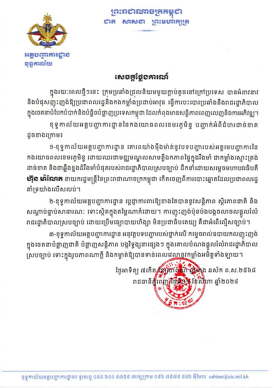 ខាងក្រោមនេះ ជាសេចក្ដីថ្លែងការណ៍ របស់ខុទ្ទកាល័យ អគ្គបញ្ជាការដ្ឋាននៃកងយោធពលខេមរភូមិន្ទ៖