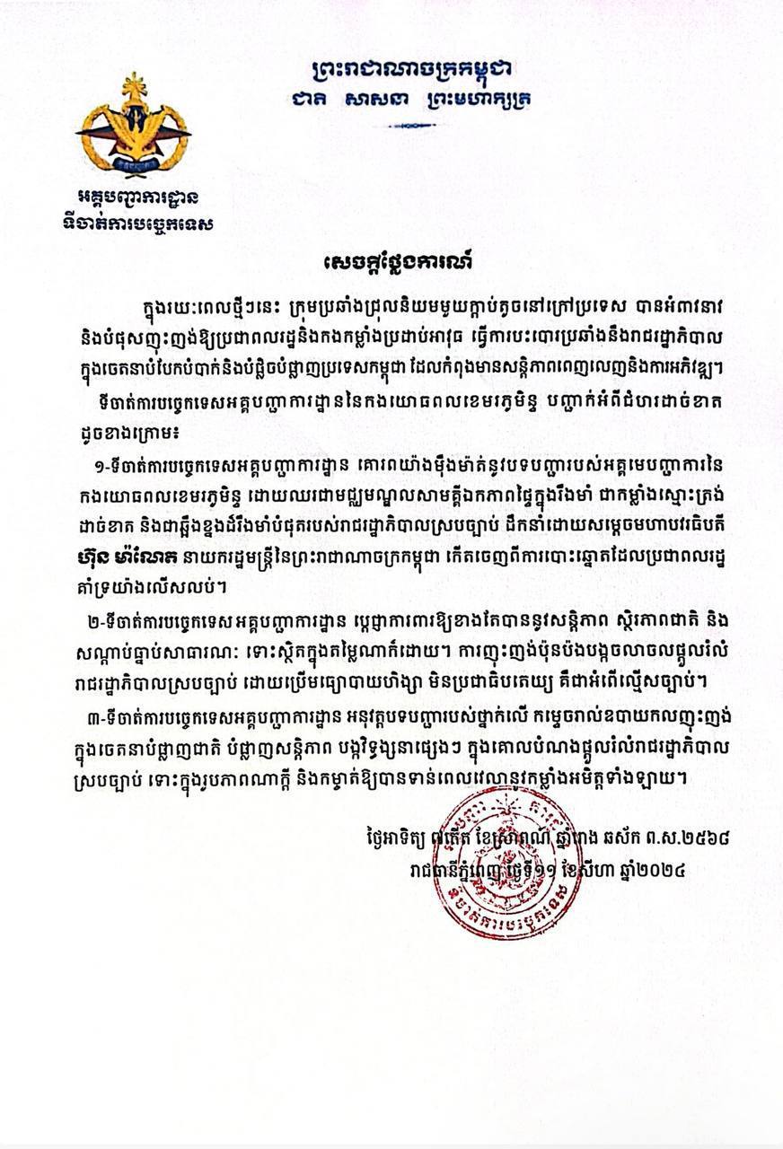 ទីចាត់ការបច្ចេកទេស អគ្គបញ្ជាការដ្ឋាននៃកងយោធពលខេមរភូមិន្ទ ចេញសេចក្ដីថ្លែងការណ៍ ថ្កោលទោស និងប្រឆាំងដាច់ខាតក្រុមឧទ្ទាមក្រៅច្បាប់ ដែលចង់ផ្ដួលរំលំរាជរដ្ឋាភិបាល និងប្ដេជ្ញាការពារសុខសន្ដិភាពជូនជាតិ និងប្រជាជន ទោះក្នុងតម្លៃណាក៏ដោយ