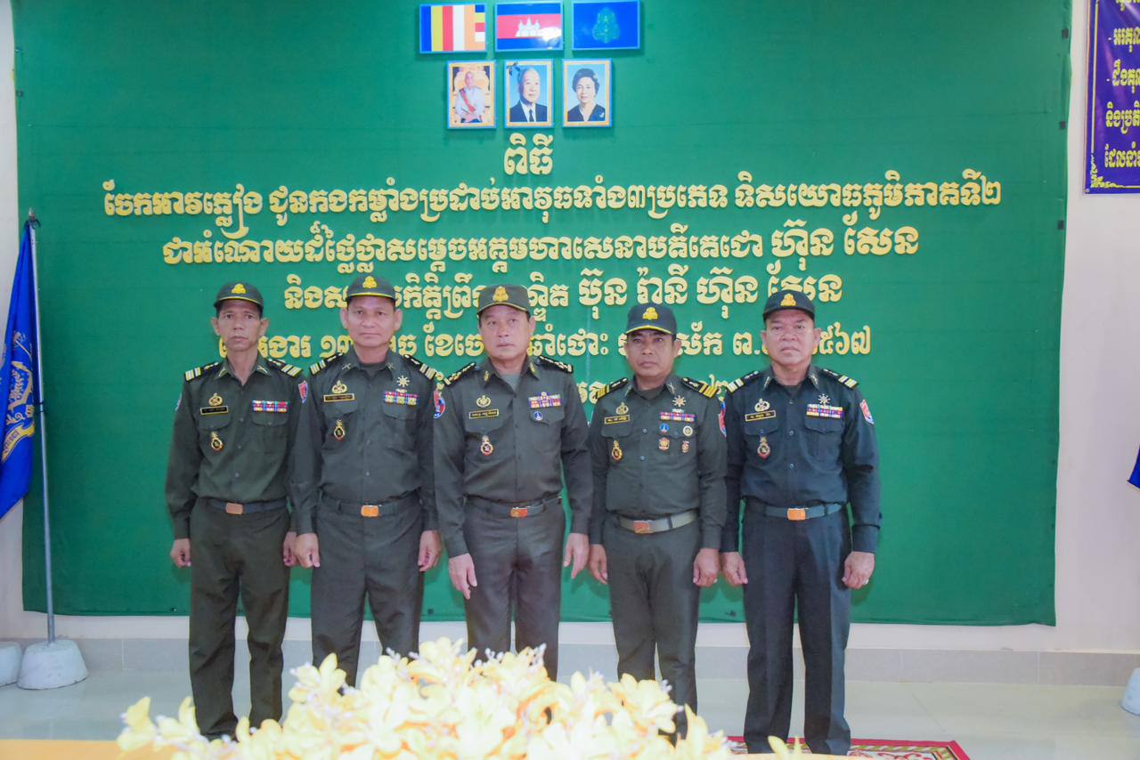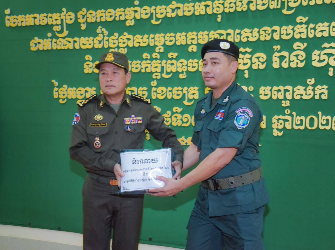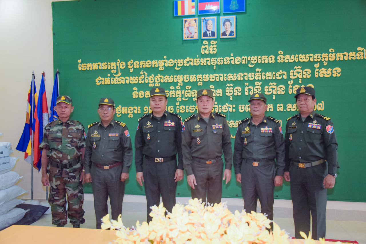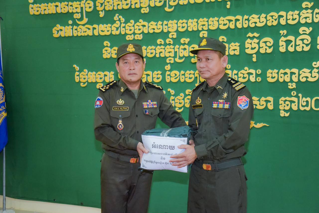 (ត្បូងឃ្មុំ)៖ នាយឧត្ដមសេនីយ៍ វង្ស ពិសេន អគ្គមេបញ្ជាការនៃកងយោធពលខេមរភូមិន្ទ បាននាំយកអាវភ្លៀងជាអំណោយដ៏ថ្លៃថ្លារបស់សម្ដេចតេជោ ហ៊ុន សែន នាយករដ្ឋមន្ត្រីកម្ពុជា និងសម្ដេចកិត្តិព្រឹទ្ធបណ្ឌិត ប៊ុន រ៉ានី ហ៊ុនសែន ទៅចែកជូនកងកម្លាំងឈរជើងនៅយោធភូមិភាគទី២ នាថ្ងៃទី១៨ ខែមេសា ឆ្នាំ២០២៣ ដែលពិធីប្រគល់អាវភ្លៀងបានធ្វើឡើងនៅទីបញ្ជាការតំបន់ប្រតិបត្តិការសឹករងត្បូងឃ្មុំ។
