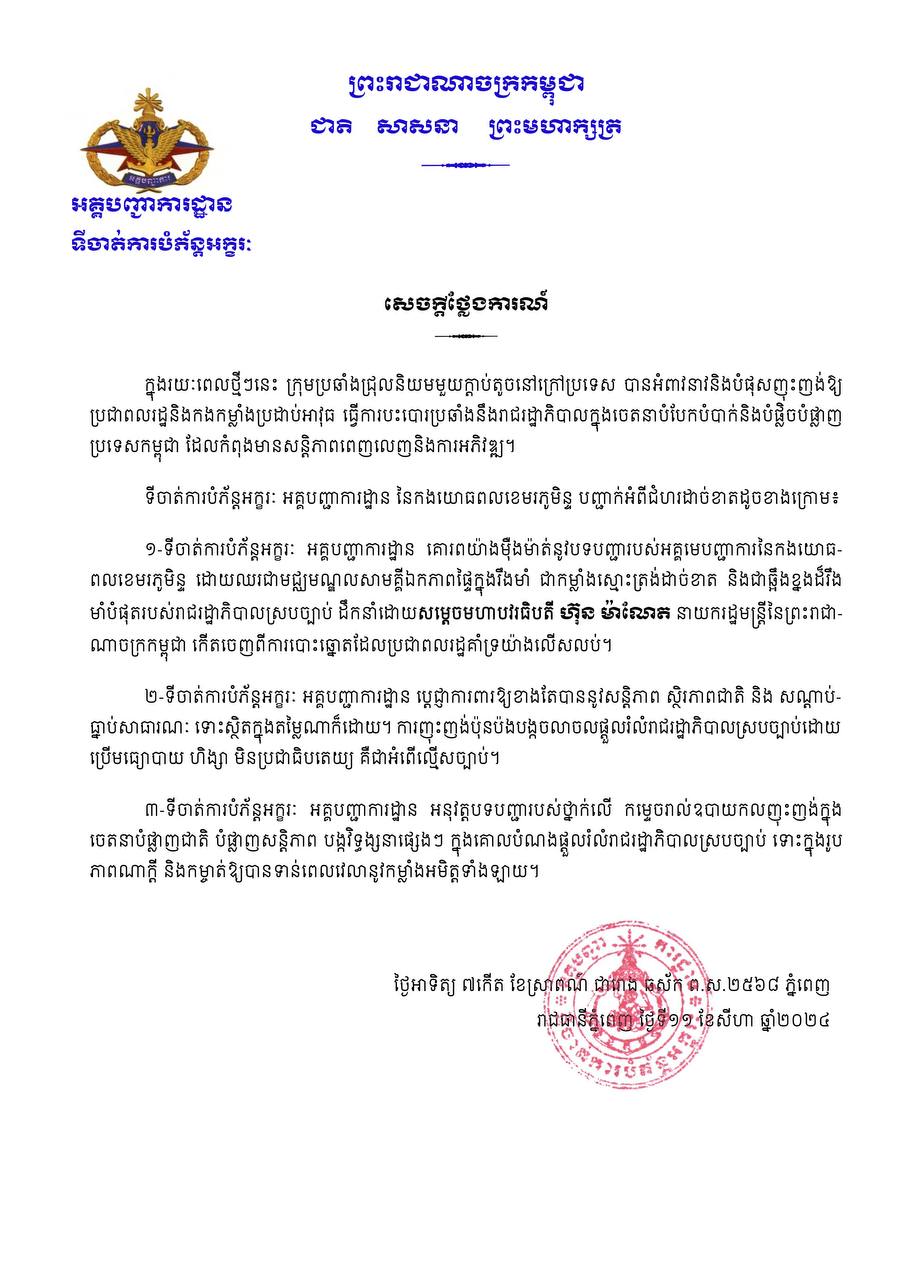 ទីចាត់ការបំភ័ន្តអក្ខរៈ អគ្គបញ្ជាការដ្ឋាននៃកងយោធពលខេមរភូមិន្ទ ចេញសេចក្ដីថ្លែងការណ៍ ថ្កោលទោស និងប្រឆាំងដាច់ខាតក្រុមឧទ្ទាមក្រៅច្បាប់ ដែលចង់ផ្ដួលរំលំរាជរដ្ឋាភិបាល និងប្ដេជ្ញាការពារសុខសន្ដិភាពជូនជាតិ និងប្រជាជន ទោះក្នុងតម្លៃណាក៏ដោយ