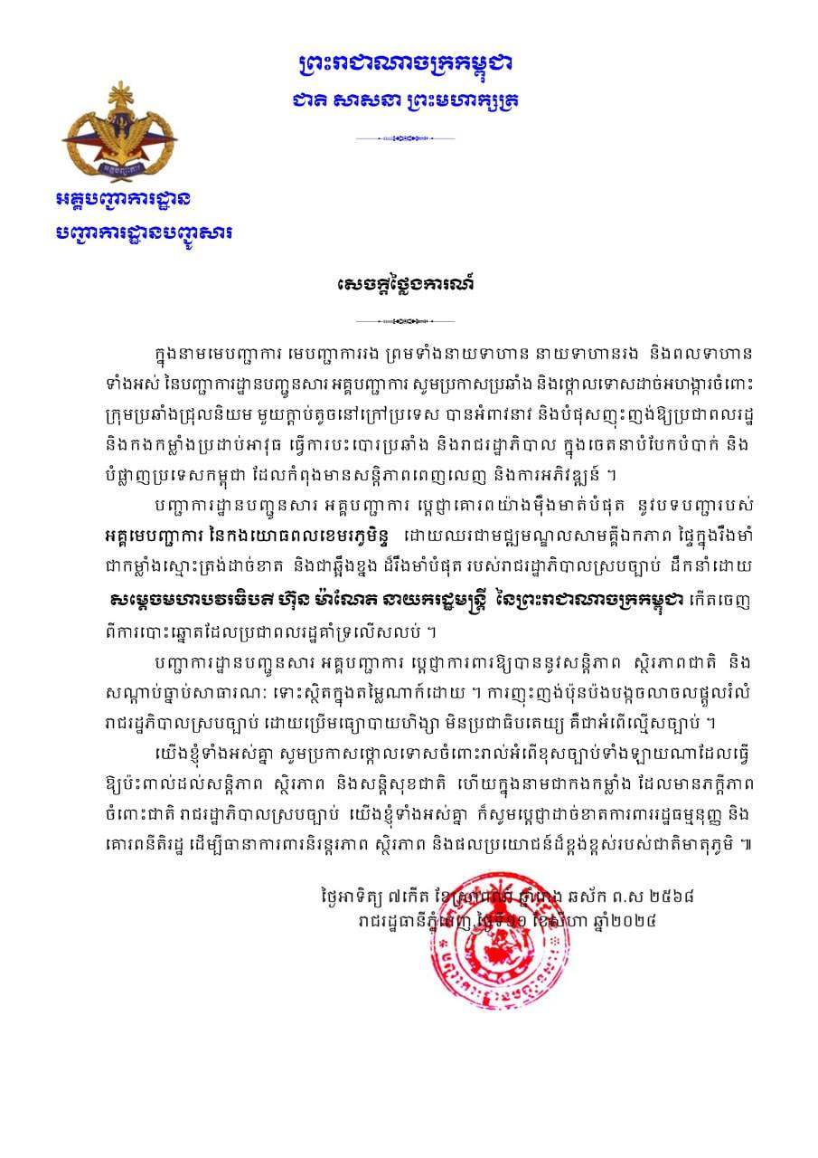 ខាងក្រោមនេះ ជាសេចក្ដីថ្លែងការណ៍ របស់បញ្ជាការដ្ឋានបញ្ជូនសារ អគ្គបញ្ជាការដ្ឋាននៃកងយោធពលខេមរភូមិន្ទ៖