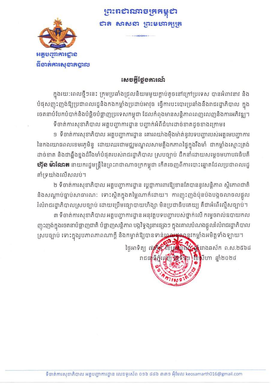 2 ទីចាត់ការសុខាភិបាល អគ្គបញ្ជាការដ្ឋាន ប្ដេជ្ញាការពារឱ្យខាងតែបាននូវសន្តិភាព ស្ថិរភាពជាតិ និង សណ្ដាប់ធ្នាប់សាធារណៈ ទោះស្ថិតក្នុងតម្លៃណាក៏ដោយ។ការញុះញង់ប៉ុនប៉ងបង្កចលាចលផ្ដួលរំលំ រាជរដ្ឋាភិបាលស្របច្បាប់ ដោយប្រើមធ្យោបាយហិង្សា មិនប្រជាធិបតេយ្យ គឺជាអំពើល្មើសច្បាប់។