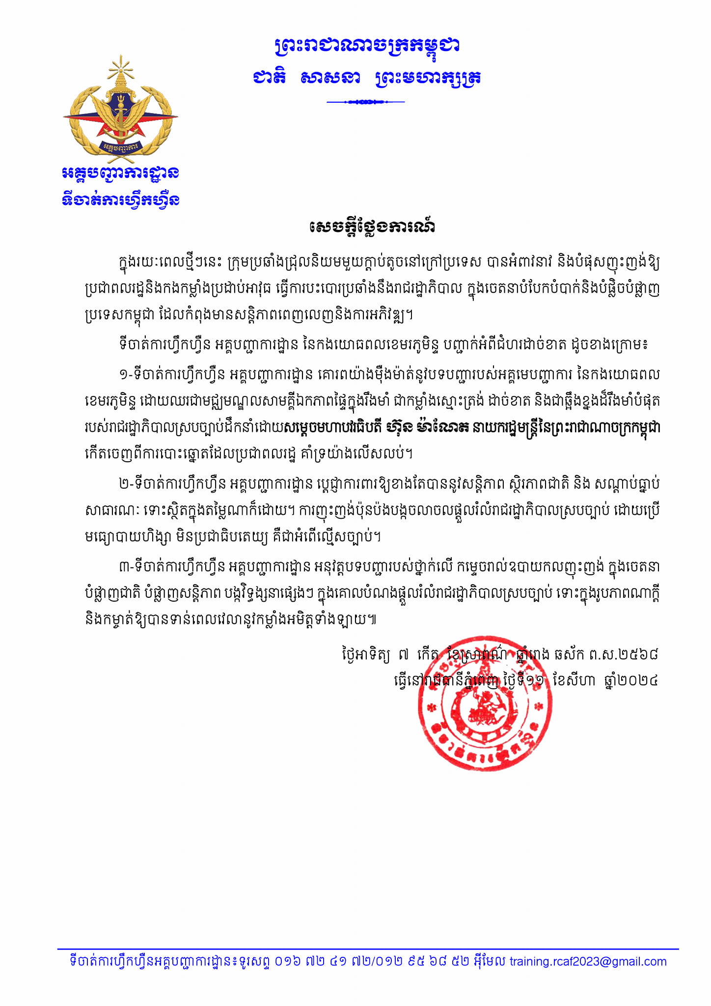 ខាងក្រោមនេះ ជាសេចក្ដីថ្លែងការណ៍ របស់ទីចាត់ការហ្វឹកហ្វឺន អគ្គបញ្ជាការដ្ឋាននៃកងយោធពលខេមរភូមិន្ទ៖