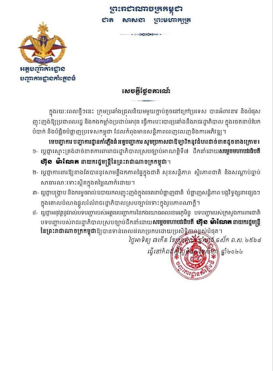 *ទី១៖ គោរពយ៉ាងម៉ឺងម៉ាត់នូវបទបញ្ជារបស់អគ្គមេបញ្ជាការនៃកងយោធពលខេមរភូមិន្ទ ដោយឈរជាមជ្ឈមណ្ឌលសាមគ្គីឯកភាពផ្ទៃក្នុងរឹងមាំ ជាកម្លាំងស្មោះត្រង់ដាច់ខាត និងជាឆ្អឹងខ្នងដ៏រឹងមាំបំផុតរបស់រាជរដ្ឋាភិបាលស្របច្បាប់ ដឹកនាំដោយសម្ដេចមហាបវរធិបតី ហ៊ុន ម៉ាណែត នាយករដ្ឋមន្រ្តីនៃព្រះរាជាណាចក្រកម្ពុជា កើតចេញពីការបោះឆ្នោតដែលប្រជាពលរដ្ឋ គាំទ្រយ៉ាងលើសលប់។
