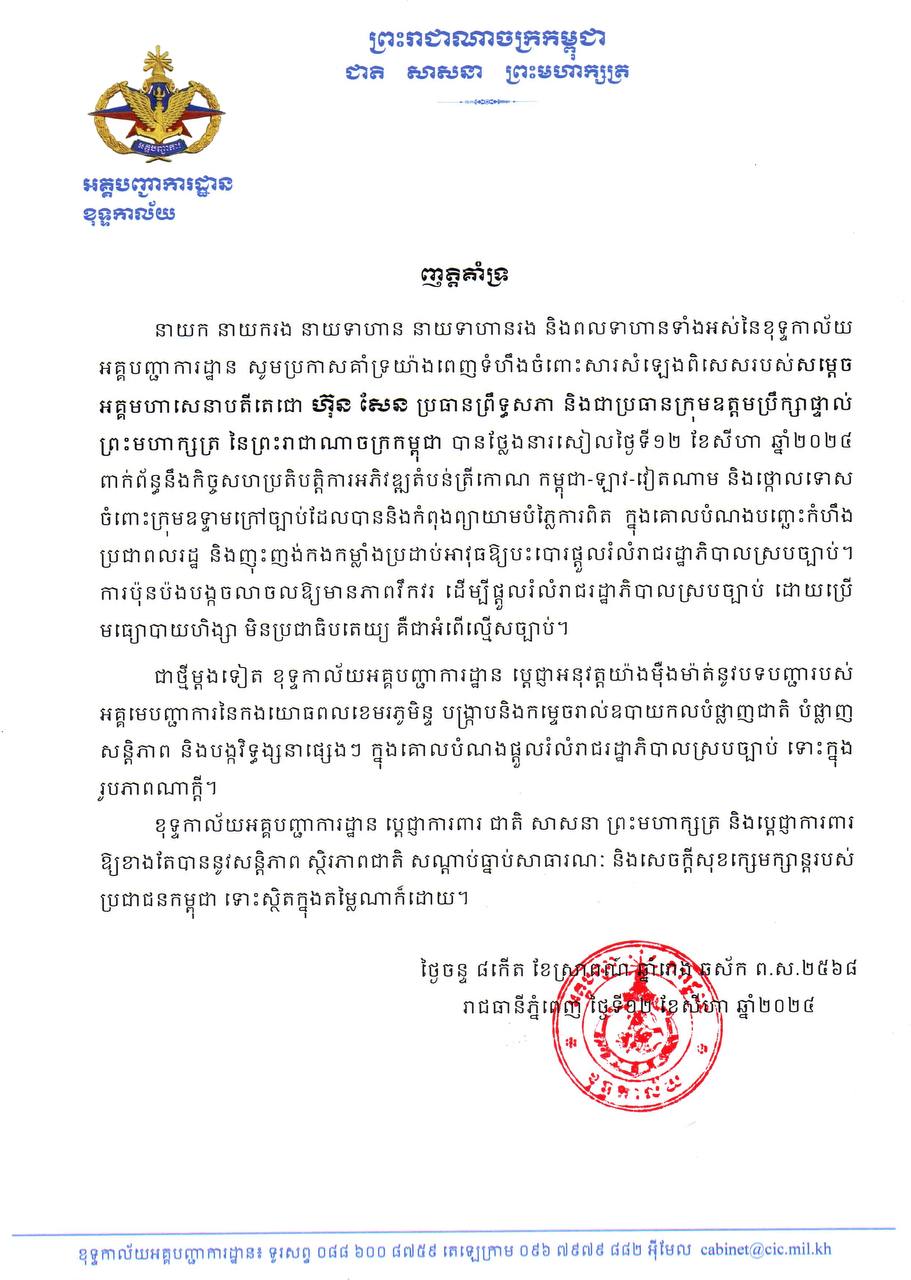 ខាងក្រោមនេះ ជាញាត្តិគាំទ្ររបស់ខុទ្ទកាល័យ អគ្គបញ្ជាការដ្ឋាននៃកងយោធពលខេមរភូមិន្ទ៖
