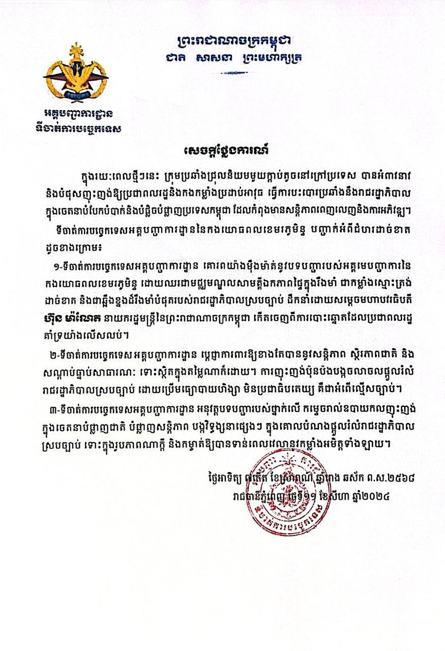 ជាថ្មីម្ដងទៀត ទីចាត់ការបច្ចេកទេស អគ្គបញ្ជាការដ្ឋានកងយោធពលខេមរភូមិន្ទ ប្ដេជ្ញាបង្រ្កាបនិងកម្ទេចរាល់ឧបាយកលបំផ្លាញជាតិ បំផ្លាញសន្តិភាព និងបង្កវិទ្ធង្សនាផ្សេងៗ ក្នុងគោលបំណងផ្ដួលរំលំរាជរដ្ឋាភិបាលស្របច្បាប់ ទោះក្នុងរូបភាពណាក្ដី។
