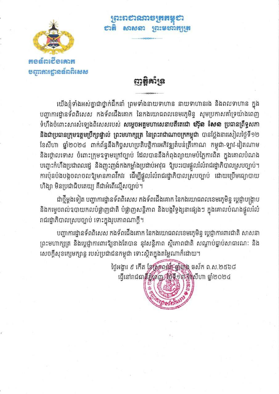 (ភ្នំពេញ)៖ ឧត្តមសេនីយ៍ទោ ស៊ុំ សំណាង មេបញ្ជាការ បញ្ជាការដ្ឋានទ័ពពិសេស ព្រមទាំងនាយទាហាន នាយទាហានរងនិងពលទាហានទាំងអស់ សូមប្រកាសគាំទ្រយ៉ាងពេញទំហឹងចំពោះសារសំឡេងពិសេសរបស់ សម្តេចអគ្គមហាសេនាបតីតេជោ ហ៊ុន សែន ប្រធានព្រឹទ្ធសភា និងជាប្រធានក្រុមឧត្តមប្រឹក្សាផ្ទាល់ ព្រះមហាក្សត្រនៃព្រះរាជាណាចក្រកម្ពុជា បានថ្លែងនារសៀលថ្ងៃទី១២ ខែសីហា ឆ្នាំ២០២៤ ពាក់ព័ន្ធនឹងកិច្ចសហប្រតិបត្តិការអភិវឌ្ឍតំបន់ត្រីកោណ កម្ពុជា–ឡាវ–វៀតណាម និង ថ្កោលទោសចំពោះក្រុមឧទ្ទាមក្រៅច្បាប់ដែលបាននិងកំពុងព្យាយាមបំភ្លៃការពិត ក្នុងគោលបំណងបញ្ឆេះកំហឹងប្រជាពលរដ្ឋ និងញុះញង់កងកម្លាំងប្រដាប់អាវុធឱ្យបះបោរផ្ដួលរំលំរាជរដ្ឋាភិបាលស្របច្បាប់។