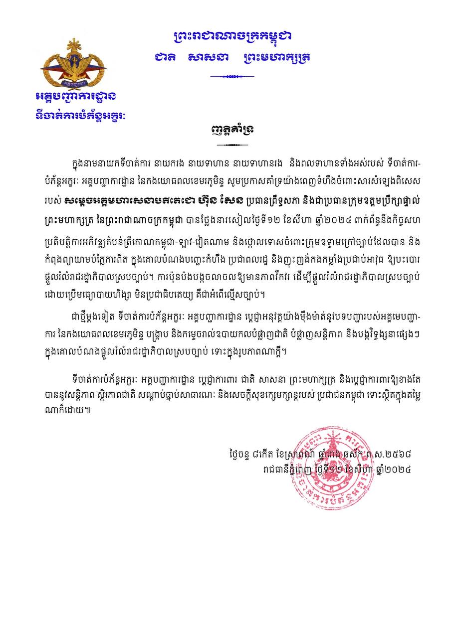 (ភ្នំពេញ)៖ ឧត្ដមសេនីយ៍ឯក មុន្នី ហោរ៉ាត នាយរងសេនាធិការចម្រុះ នាយកទីចាត់ការបំភ័ន្តអក្ខរៈ អគ្គបញ្ជាការ ព្រមទាំងនាយទាហាន នាយទាហានរង និងពលទាហានទាំងអស់ សូមប្រកាសគាំទ្រយ៉ាងពេញទំហឹងចំពោះសារសំឡេងពិសេសរបស់ សម្តេចអគ្គមហាសេនាបតីតេជោ ហ៊ុន សែន ប្រធានព្រឹទ្ធសភា  និងជាប្រធានក្រុមឧត្តមប្រឹក្សាផ្ទាល់ ព្រះមហាក្សត្រនៃព្រះរាជាណាចក្រកម្ពុជា បានថ្លែងនារសៀលថ្ងៃទី១២ ខែសីហា ឆ្នាំ២០២៤  ពាក់ព័ន្ធនឹងកិច្ចសហប្រតិបត្តិការអភិវឌ្ឍតំបន់ត្រីកោណ កម្ពុជាឡាវវៀតណាម និង ថ្កោលទោសចំពោះក្រុមឧទ្ទាមក្រៅច្បាប់ដែលបាននិងកំពុងព្យាយាមបំភ្លៃការពិត ក្នុងគោលបំណងបញ្ឆេះកំហឹងប្រជាពលរដ្ឋ និងញុះញង់កងកម្លាំងប្រដាប់អាវុធឱ្យបះបោរផ្ដួលរំលំរាជរដ្ឋាភិបាលស្របច្បាប់។