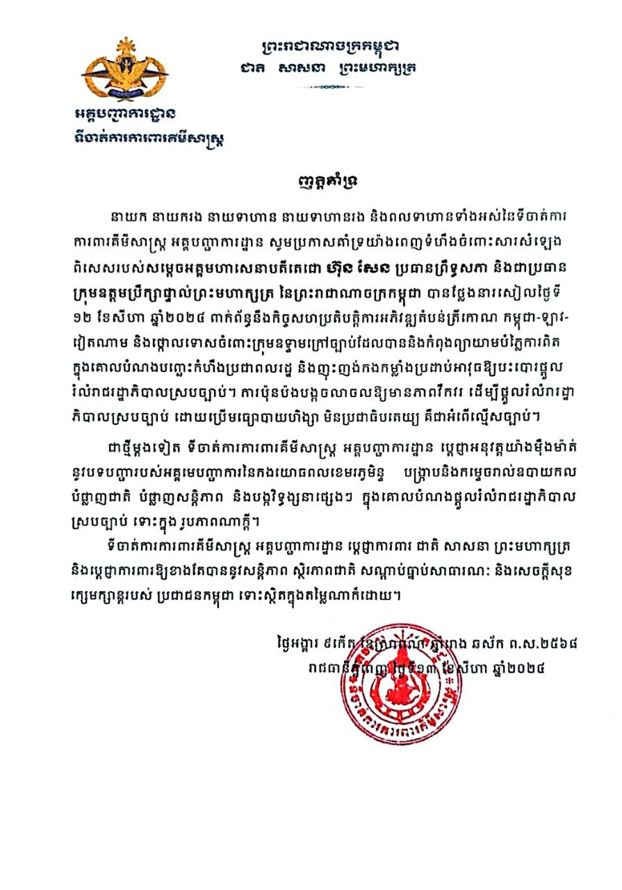 (ភ្នំពេញ)៖ ឧត្តមសេនីយ៍ឯក ឈឹម សាវុធ នាយរងសេនាធិការចម្រុះ និងជានាយកទីចាត់ការការពារគីមីសាស្រ្ត អគ្គបញ្ជាការ ព្រមទាំងនាយទាហាន នាយទាហានរង និងពលទាហានទាំងអស់ សូមប្រកាសគាំទ្រយ៉ាងពេញទំហឹងចំពោះសារសំឡេងពិសេសរបស់ សម្តេចអគ្គមហាសេនាបតីតេជោ ហ៊ុន សែន ប្រធានព្រឹទ្ធសភា និងជាប្រធានក្រុមឧត្តមប្រឹក្សាផ្ទាល់ ព្រះមហាក្សត្រនៃព្រះរាជាណាចក្រកម្ពុជា បានថ្លែងនារសៀលថ្ងៃទី១២ ខែសីហា ឆ្នាំ២០២៤ ពាក់ព័ន្ធនឹងកិច្ចសហប្រតិបត្តិការអភិវឌ្ឍតំបន់ត្រីកោណ កម្ពុជា-ឡាវ-វៀតណាម និង ថ្កោលទោសចំពោះក្រុមឧទ្ទាមក្រៅច្បាប់ដែលបាននិងកំពុងព្យាយាមបំភ្លៃការពិត ក្នុងគោលបំណងបញ្ឆេះកំហឹងប្រជាពលរដ្ឋ និងញុះញង់កងកម្លាំងប្រដាប់អាវុធឱ្យបះបោរផ្ដួលរំលំរាជរដ្ឋាភិបាលស្របច្បាប់។