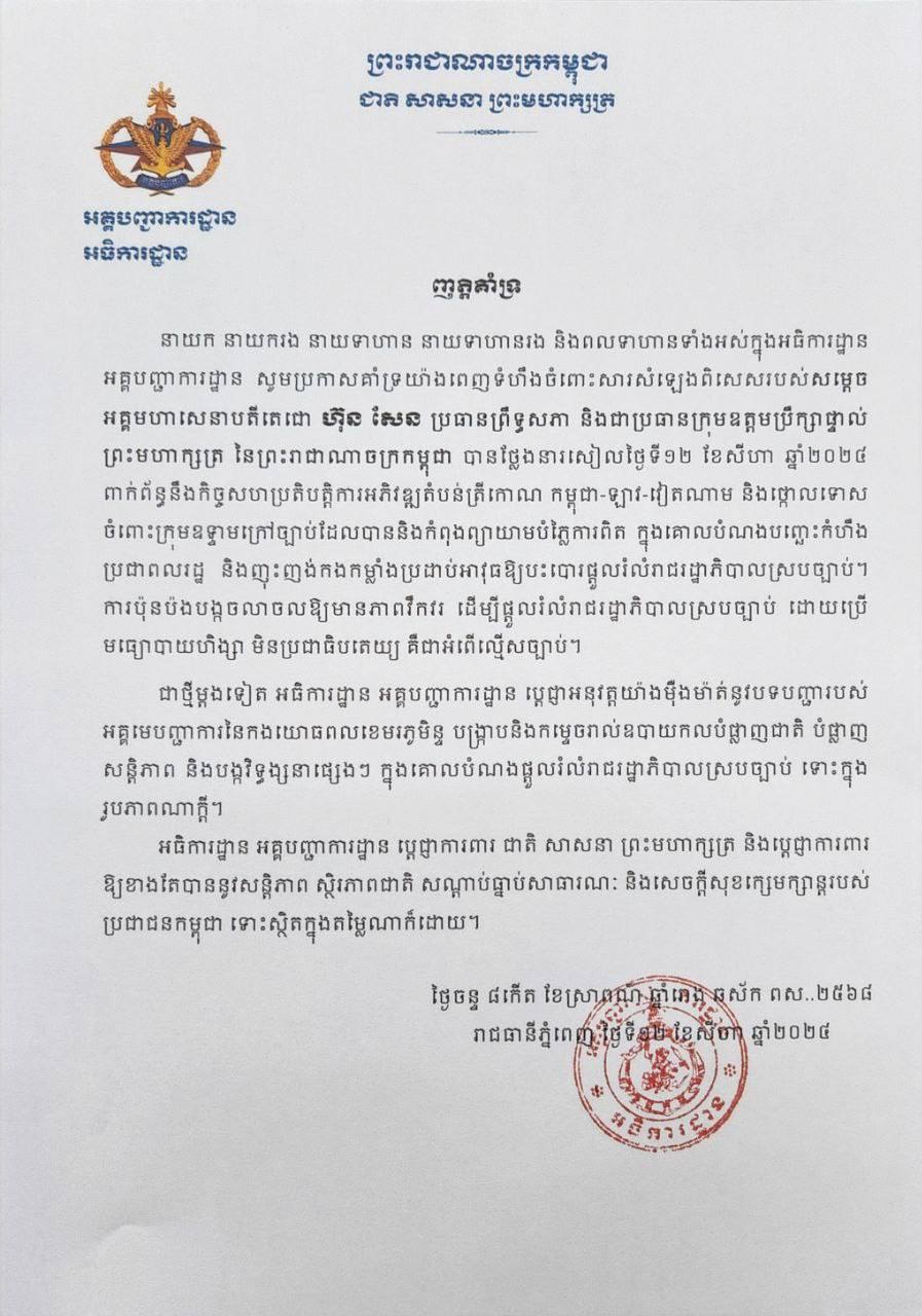 នាយក អធិការដ្ឋាន អគ្គបញ្ជាការដ្ឋាន សូមប្រកាសគាំទ្រយ៉ាងពេញទំហឹងចំពោះសារសំឡេងពិសេសរបស់ សម្តេចតេជោ ហ៊ុន សែន ប្រធានព្រឹទ្ធសភានៃព្រះរាជាណាចក្រកម្ពុជាពាក់ព័ន្ធនឹងកិច្ចសហប្រតិបត្តិការអភិវឌ្ឍតំបន់ ត្រីកោណ កម្ពុជា-ឡាវ-វៀតណាម