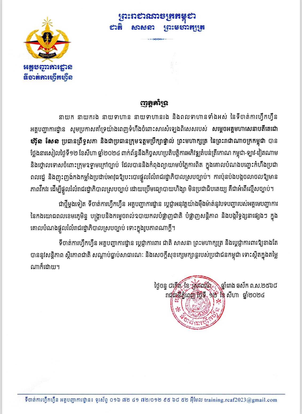 (ភ្នំពេញ)៖ ឧត្ដមសេនីយ៍ទោ ប៉ែន សុក្រិត្យវិទ្យា នាយកទីចាត់ការហ្វឹកហ្វឺន អគ្គបញ្ជាការ ព្រមទាំងនាយទាហាន នាយទាហានរង និងពលទាហានទាំងអស់ សូមប្រកាសគាំទ្រយ៉ាងពេញទំហឹងចំពោះសារសំឡេងពិសេសរបស់ សម្តេចអគ្គមហាសេនាបតីតេជោ ហ៊ុន សែន ប្រធានព្រឹទ្ធសភា និងជាប្រធានក្រុមឧត្តមប្រឹក្សាផ្ទាល់ ព្រះមហាក្សត្រនៃព្រះរាជាណាចក្រកម្ពុជា បានថ្លែងនារសៀលថ្ងៃទី១២ ខែសីហា ឆ្នាំ២០២៤ ពាក់ព័ន្ធនឹងកិច្ចសហប្រតិបត្តិការអភិវឌ្ឍតំបន់ត្រីកោណ កម្ពុជា–ឡាវ–វៀតណាម និង ថ្កោលទោសចំពោះក្រុមឧទ្ទាមក្រៅច្បាប់ដែលបាននិងកំពុងព្យាយាមបំភ្លៃការពិត ក្នុងគោលបំណងបញ្ឆេះកំហឹងប្រជាពលរដ្ឋ និងញុះញង់កងកម្លាំងប្រដាប់អាវុធឱ្យបះបោរផ្ដួលរំលំរាជរដ្ឋាភិបាលស្របច្បាប់។