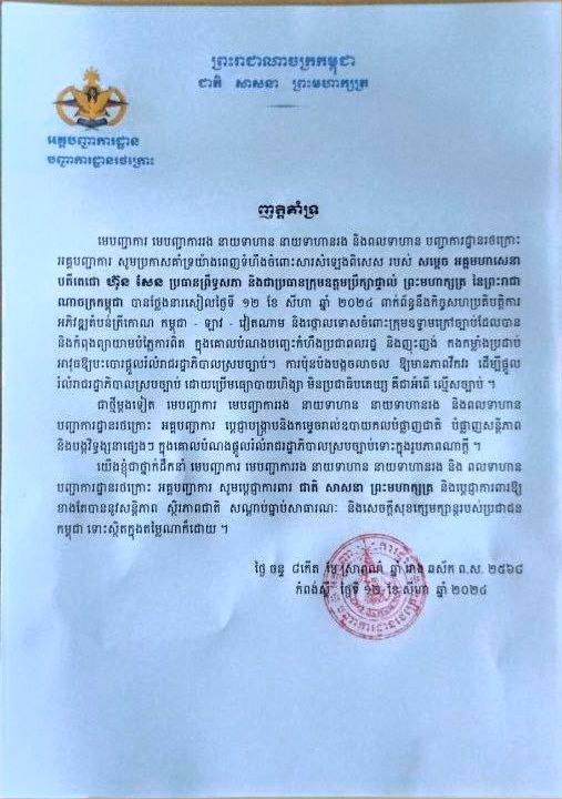(ភ្នំពេញ)៖ ឧត្តមសេនីយ៍ឯក ឡាញ់ កៅ មេបញ្ជាការ បញ្ជាការដ្ឋានកងរថក្រោះ អគ្គបញ្ជាការ ព្រមទាំងនាយទាហាន នាយទាហានរង និងពលទាហានទាំងអស់ សូមប្រកាសគាំទ្រយ៉ាងពេញទំហឹងចំពោះសារសំឡេងពិសេសរបស់ សម្តេចអគ្គមហាសេនាបតីតេជោ ហ៊ុន សែន ប្រធានព្រឹទ្ធសភា  និងជាប្រធានក្រុមឧត្តមប្រឹក្សាផ្ទាល់ ព្រះមហាក្សត្រនៃព្រះរាជាណាចក្រកម្ពុជា បានថ្លែងនារសៀលថ្ងៃទី១២ ខែសីហា ឆ្នាំ២០២៤  ពាក់ព័ន្ធនឹងកិច្ចសហប្រតិបត្តិការអភិវឌ្ឍតំបន់ត្រីកោណ កម្ពុជា-ឡាវ-វៀតណាម និង ថ្កោលទោសចំពោះក្រុមឧទ្ទាមក្រៅច្បាប់ដែលបាននិងកំពុងព្យាយាមបំភ្លៃការពិត ក្នុងគោលបំណងបញ្ឆេះកំហឹងប្រជាពលរដ្ឋ និងញុះញង់កងកម្លាំងប្រដាប់អាវុធឱ្យបះបោរផ្ដួលរំលំរាជរដ្ឋាភិបាលស្របច្បាប់។